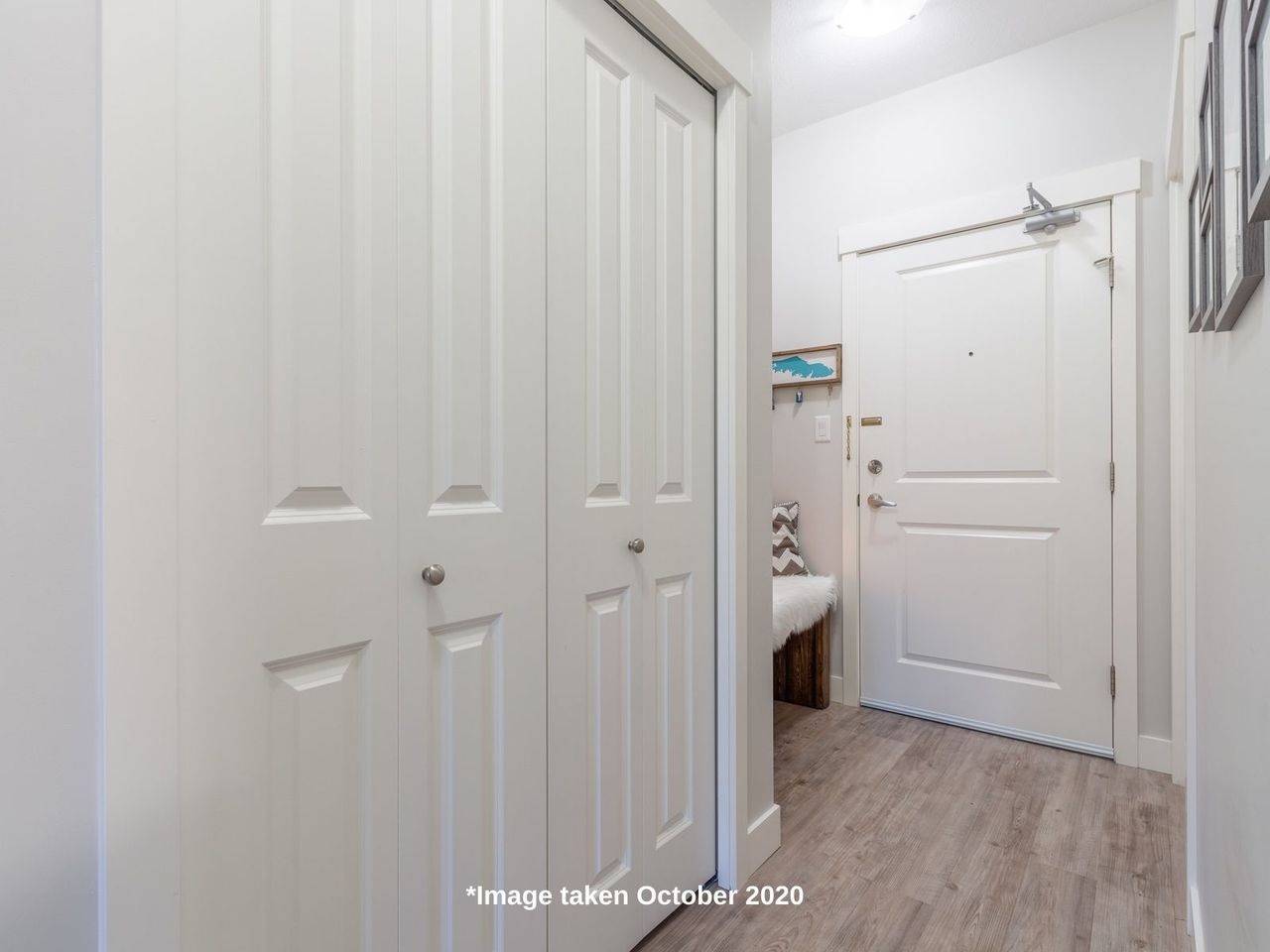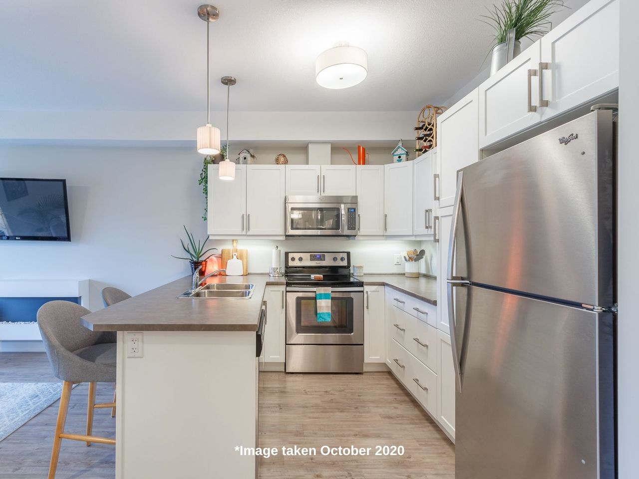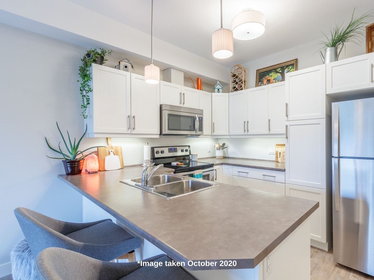 Vinyl plank flooring flows throughout the open concept living area which boasts 9’ ceilings, a well-appointed, contemporary kitchen with white shaker style cabinetry, stainless steel appliances, and a convenient eating bar, while the cozy living room provides access to a large 133 sqft deck. An extension of the living space, this area is covered for year-round use and is the perfect place to while away a warm summer evening or to BBQ whatever the weather. The spacious master provides the ideal sanctuary at the end of a long day while a tastefully finished 4-piece bathroom and handy in-unit laundry facilities are just steps away and complete this space.