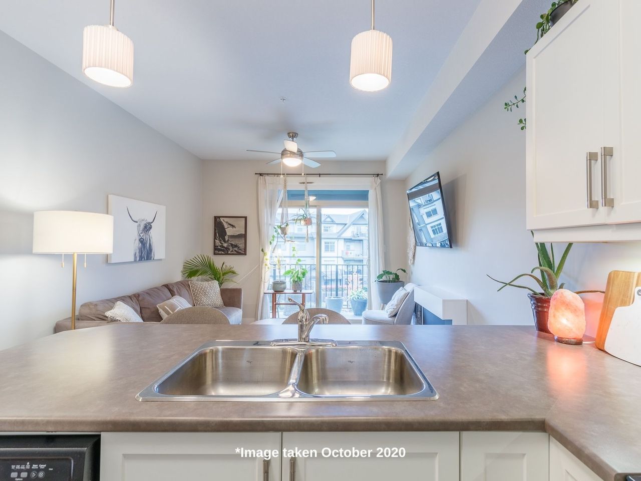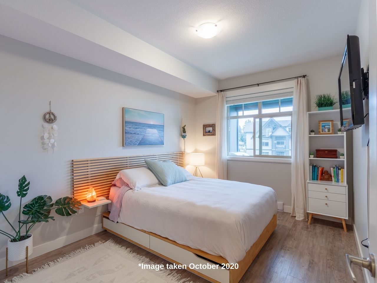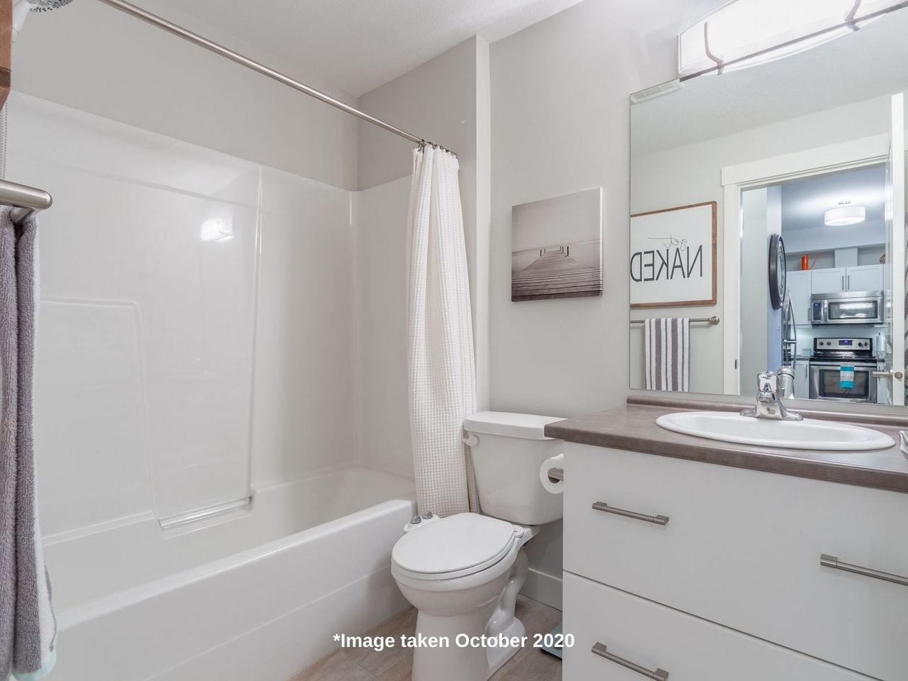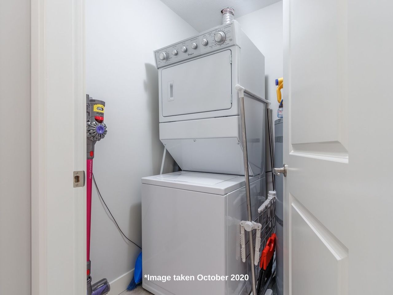Vinyl plank flooring flows throughout the open concept living area which boasts 9’ ceilings, a well-appointed, contemporary kitchen with white shaker style cabinetry, stainless steel appliances, and a convenient eating bar, while the cozy living room provides access to a large 133 sqft deck. An extension of the living space, this area is covered for year-round use and is the perfect place to while away a warm summer evening or to BBQ whatever the weather. The spacious master provides the ideal sanctuary at the end of a long day while a tastefully finished 4-piece bathroom and handy in-unit laundry facilities are just steps away and complete this space.