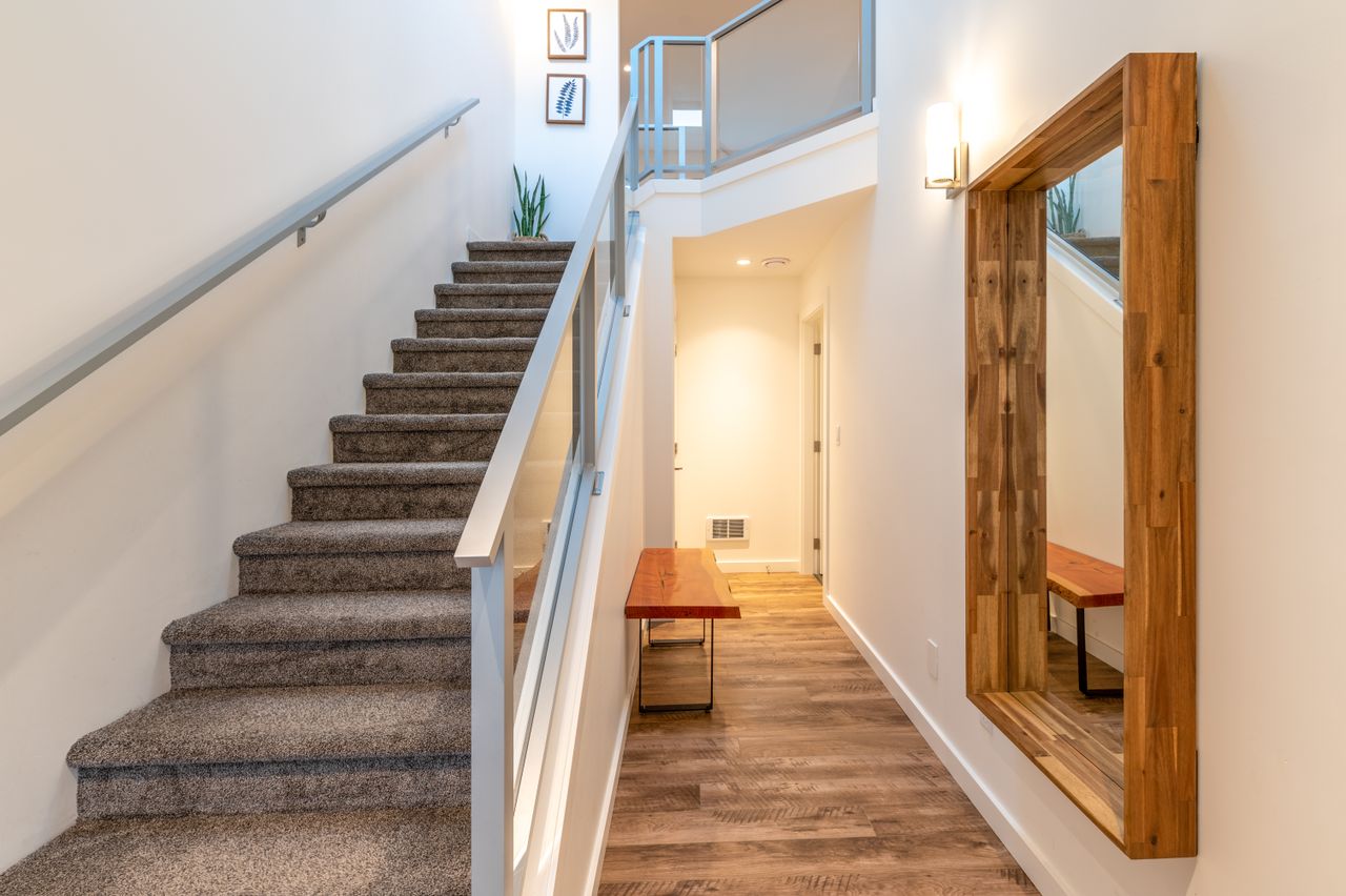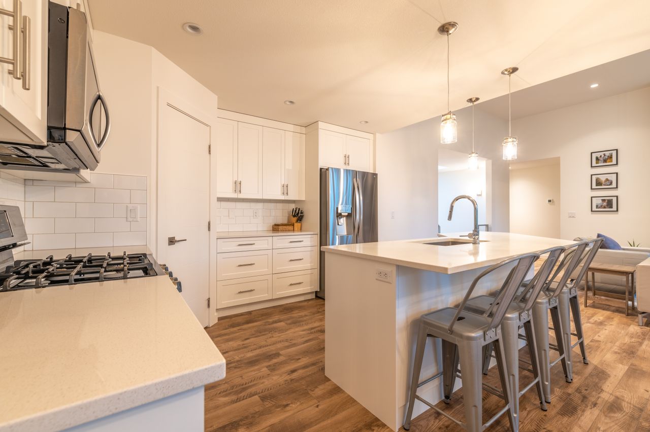 Once inside you will be drawn in and up to the main level where you will appreciate the functional, well-appointed floor plan and large windows with an open concept living/dining/kitchen area ideal for family time. A sleek fireplace will take the chill off a cooler evening while the spacious dining area will be the perfect place for friends and family to gather with the covered deck extending the living space regardless of the weather. The bright kitchen features a pantry, a large island with an eating bar, stainless steel appliances, and solid surface counters that are sure to impress the chef in the family, making meal prep a breeze.