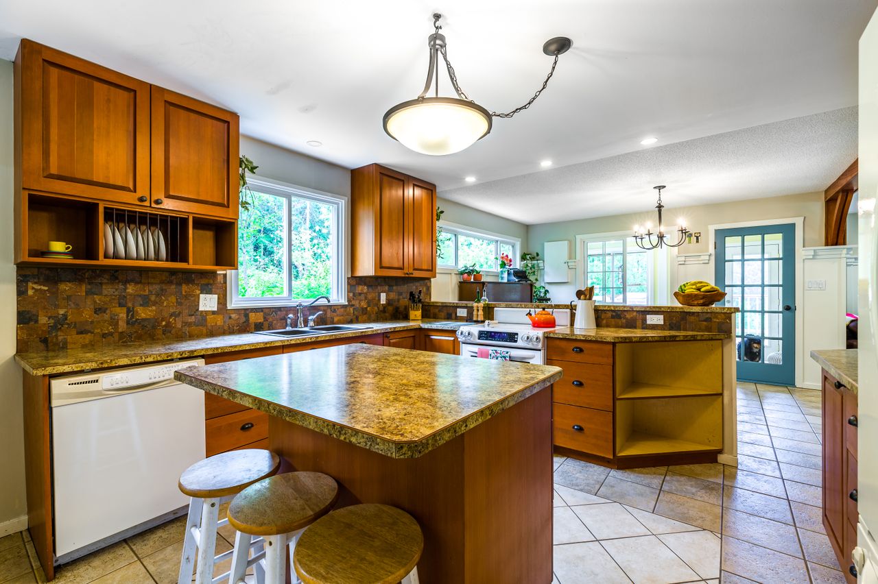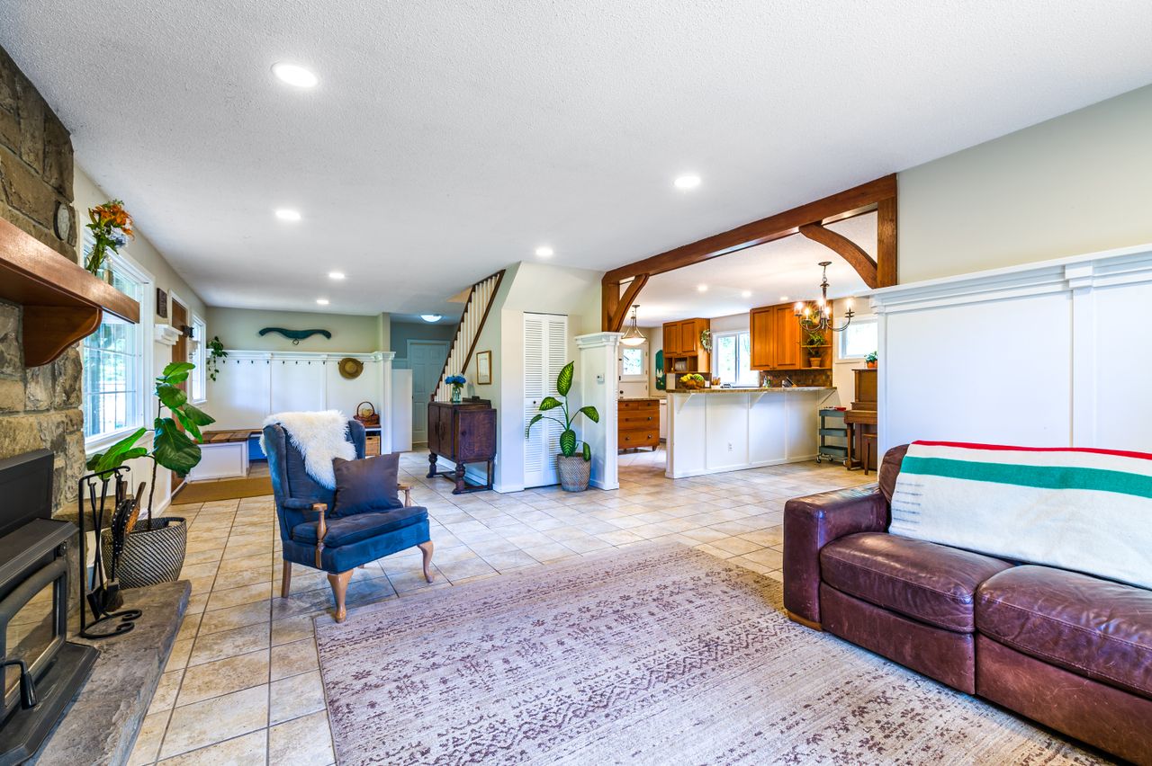 You will be drawn into the two-storey country-style residence set amid picturesque mature landscaping and into a spacious entry area that invites you into this home. The open concept directs the flow into the living space featuring wood paneling and a floor-to-ceiling stone fireplace with a high-efficiency wood burning insert that comfortably heats the whole house, and through to the dining area, the ideal place to gather for a casual evening meal or more formal occasions. A den, currently used as a playroom, is conveniently accessed from this space, itself providing passage through French doors to the deck looking out to the pond. A well-appointed kitchen adjoins the dining area and offers the chef in the family ample cabinet and counter space to cater to all their culinary needs with convenient access out to the double carport via a private patio area.