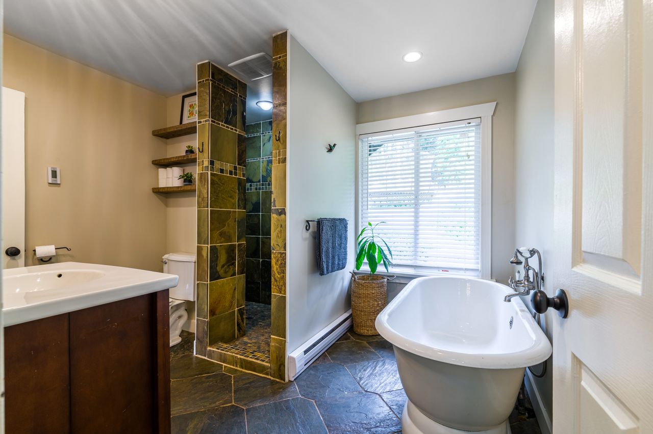 Also situated on the main level, the primary bedroom is just off the entry and boasts a spacious walk-in closet with convenient laundry facilities and cheater ensuite access to a main 4-piece bathroom offering a spa-like experience with a large walk-in shower and a free-standing soaker tub that is the perfect place to unwind at the end of a long day.