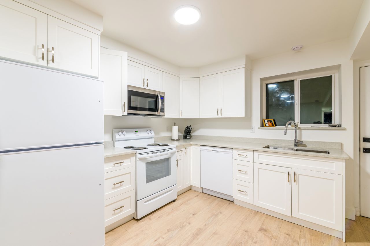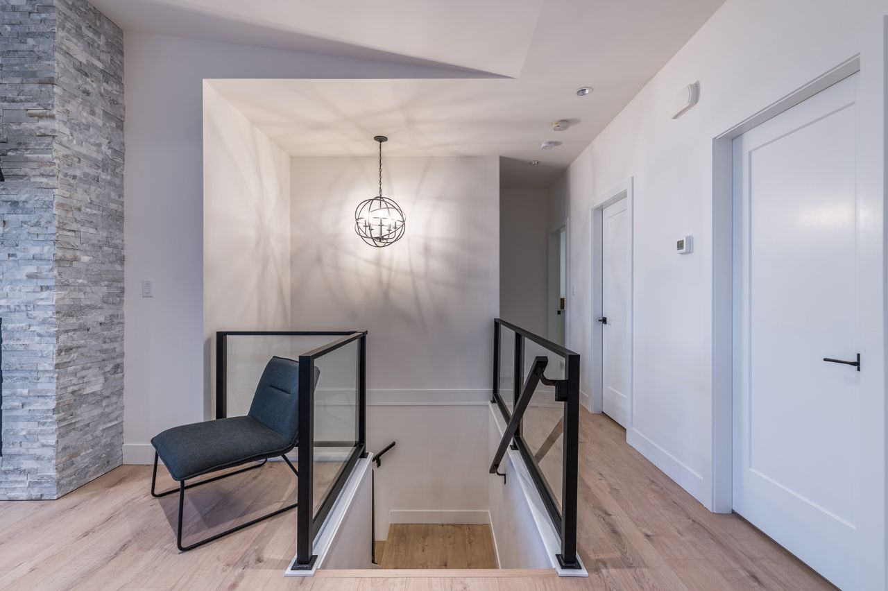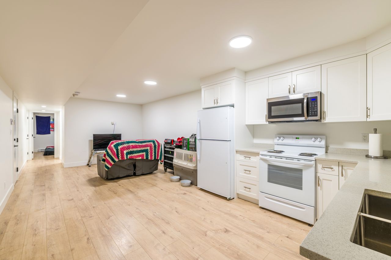 The lower level offers a bedroom and laundry facilities in the mainspace and access to the well-appointed one-bedroom suite featuring contemporary finishes, a spacious living space, a full kitchen with solid surface counters, a 4-piece bathroom, laundry facilities, and its own entrance.
