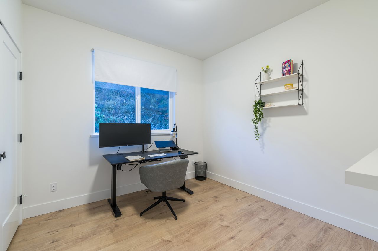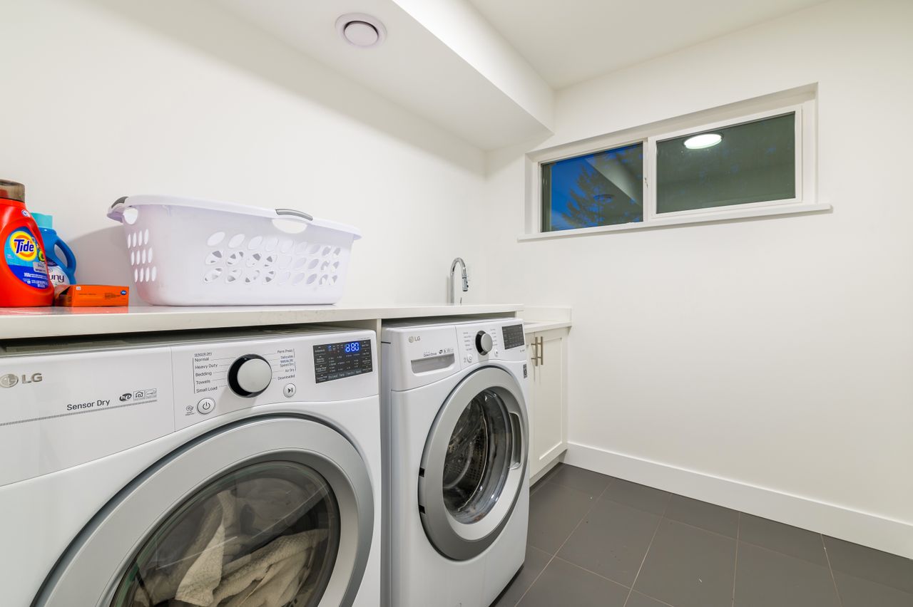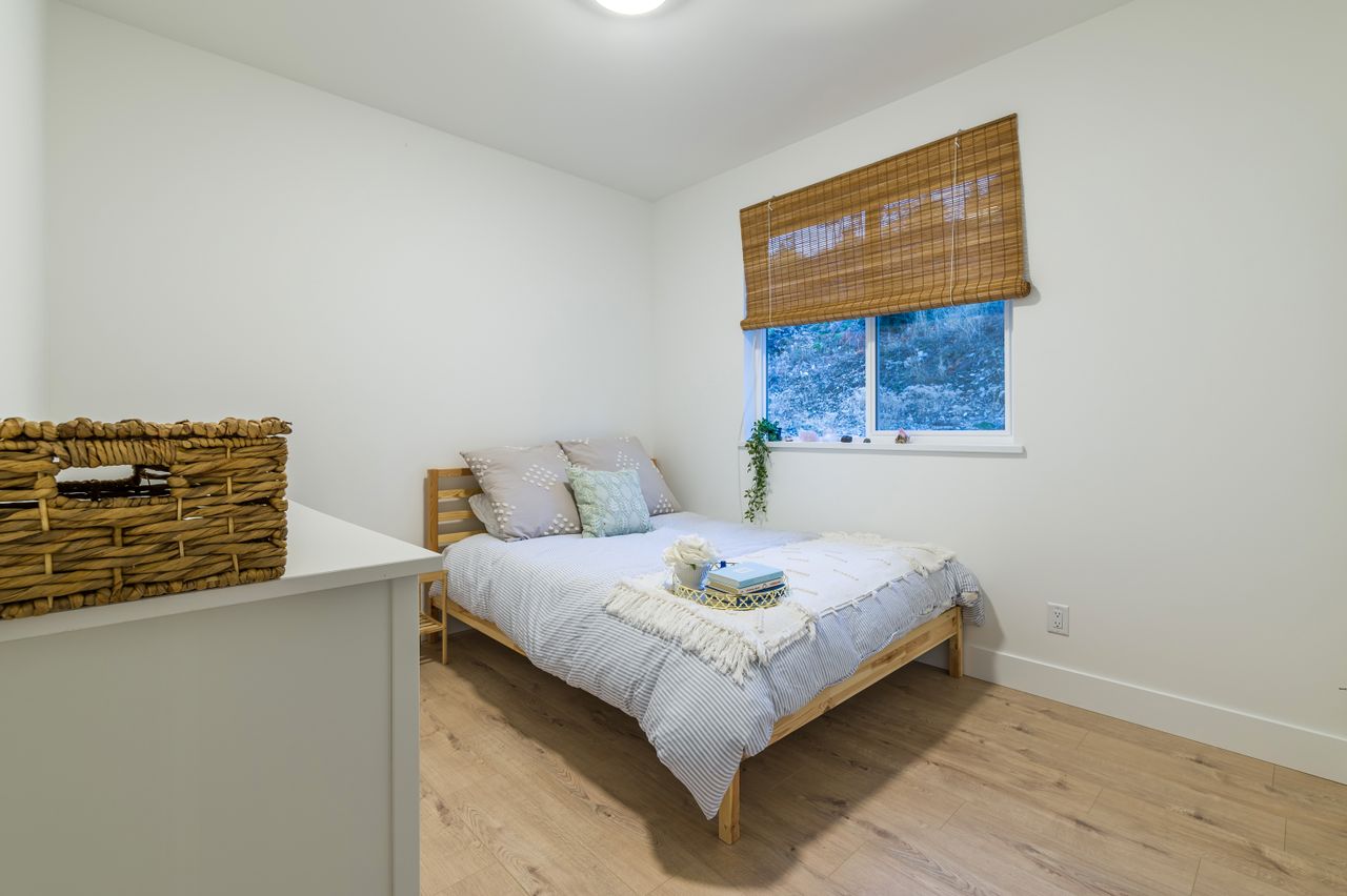 The lower level offers a bedroom and laundry facilities in the mainspace and access to the well-appointed one-bedroom suite featuring contemporary finishes, a spacious living space, a full kitchen with solid surface counters, a 4-piece bathroom, laundry facilities, and its own entrance.