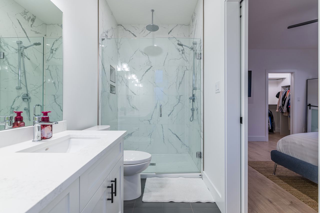 There are three bedrooms on this family-friendly upper level including the primary suite with a 4-piece ensuite featuring a spacious walk-in shower with rain shower head and dual sinks, as well as a large walk-in closet with built-in shelving.
