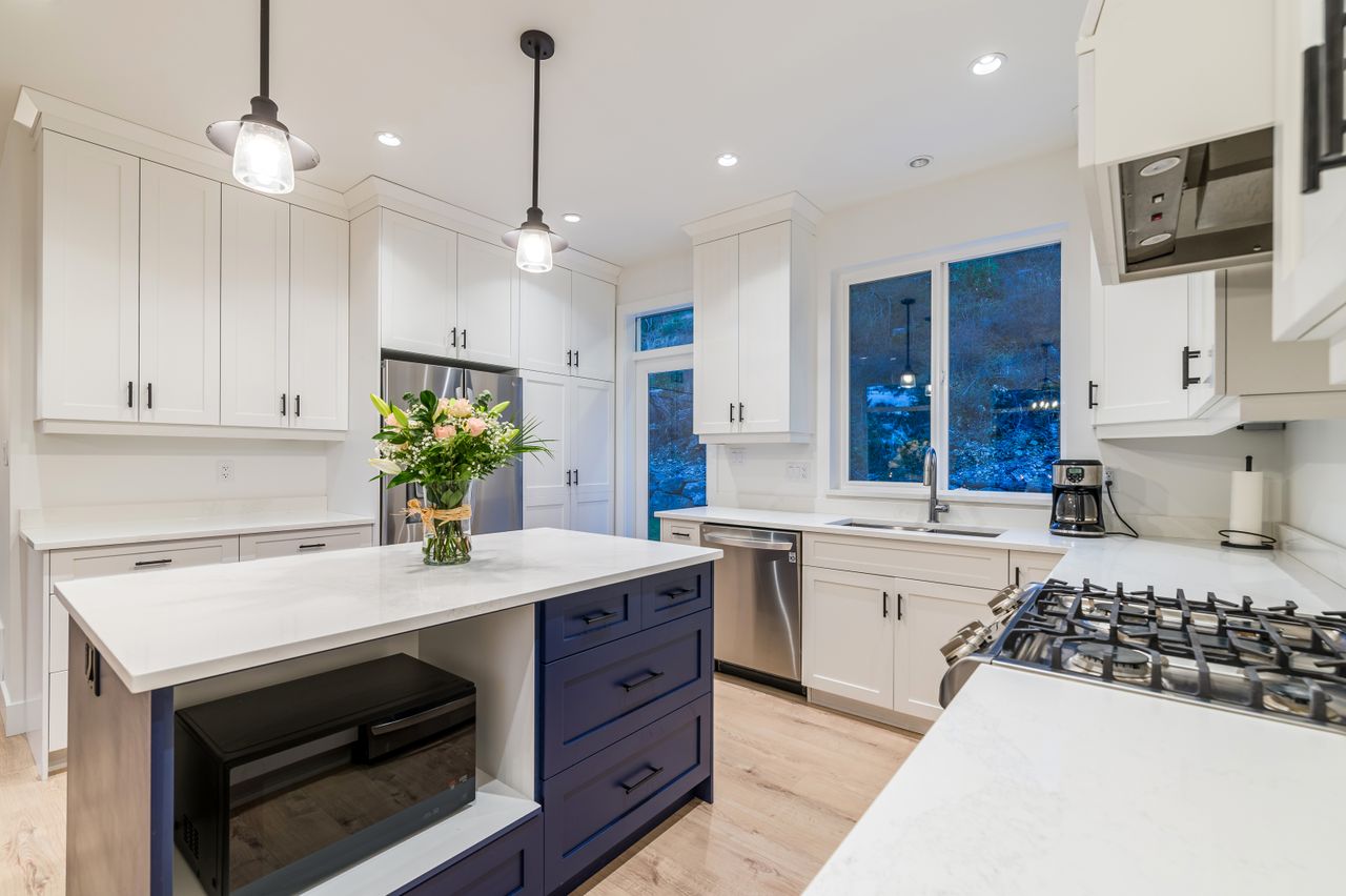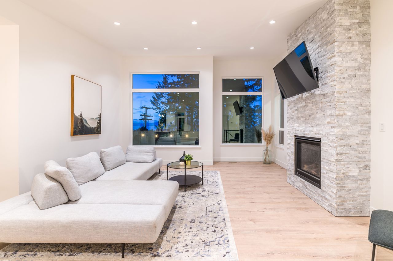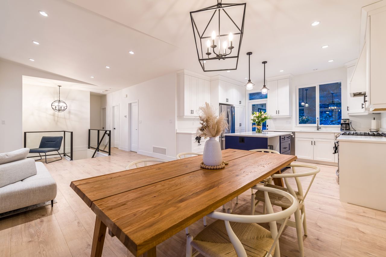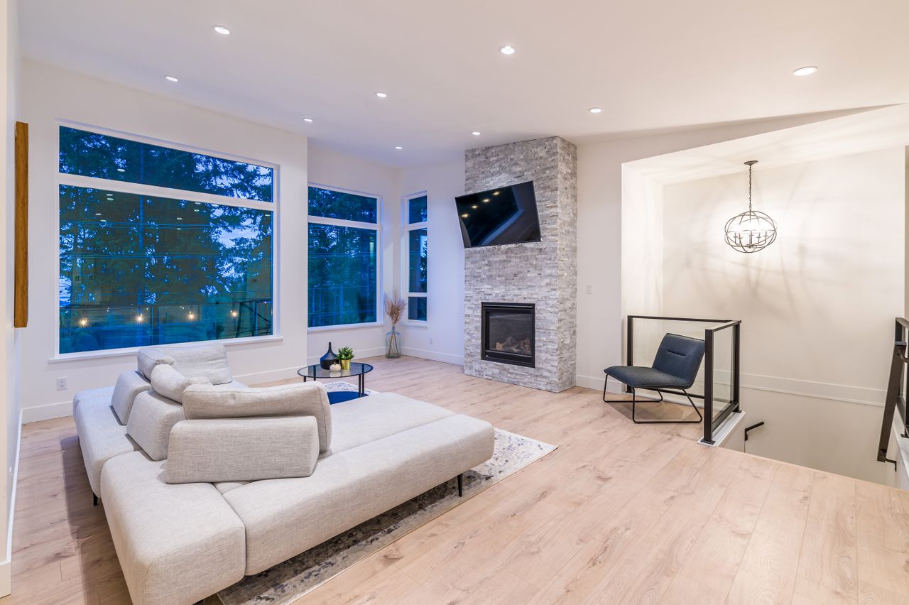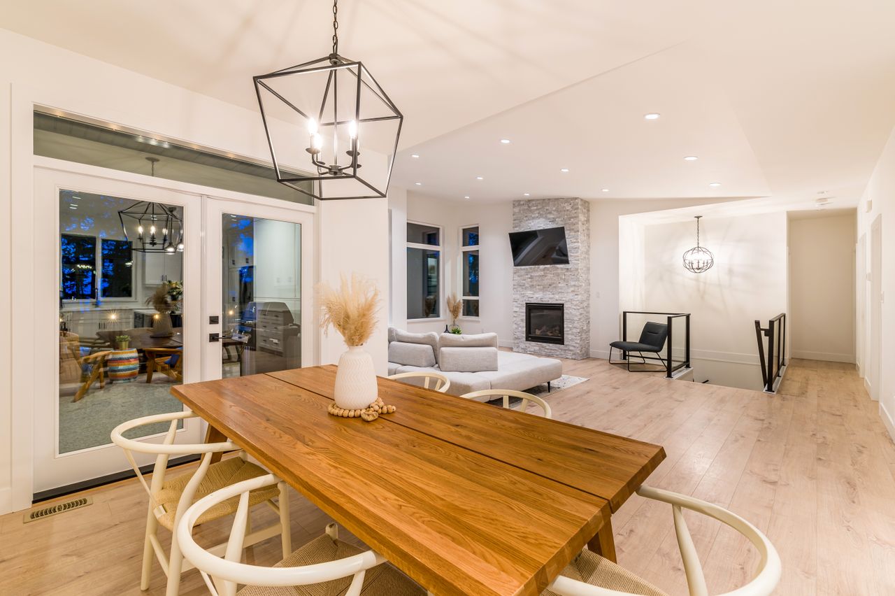 Ideal for entertaining or for spending time together as a family, the open concept upper floor with engineered hardwood flooring offers a chef’s kitchen, the heart of the home, boasting solid surface counters, stainless steel appliances, and an island providing plenty of room for meal prep while a 230 sqft patio and backyard accessible from this space is a perfect extension of the living area for entertaining or for everyday use. An adjoining dining space is the ideal venue for a casual meal or for more formal dining while the living room features vaulted ceilings and a stacked stone fireplace, perfect for a cozy evening at home or for adding ambiance whatever the occasion while a 200 sqft balcony off the dining room provides a comfortable setting to enjoy a glass of wine as you take in the ocean views.