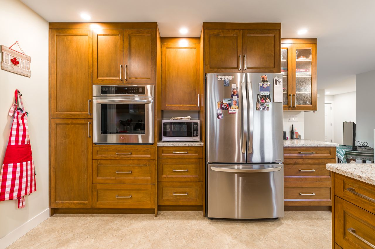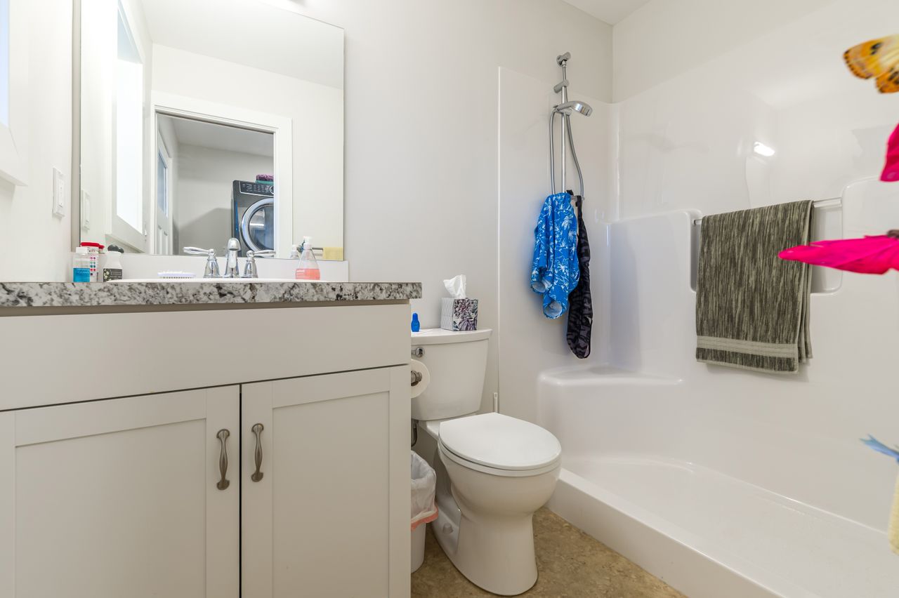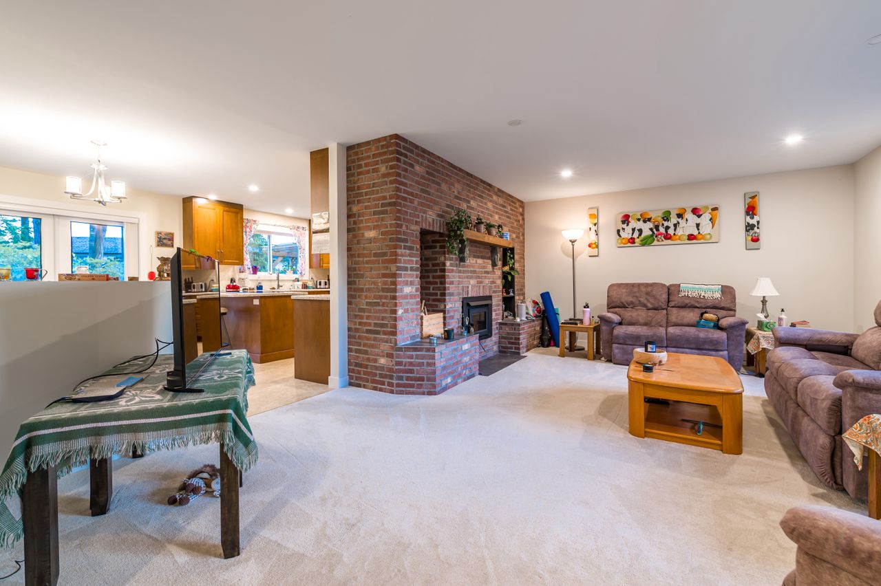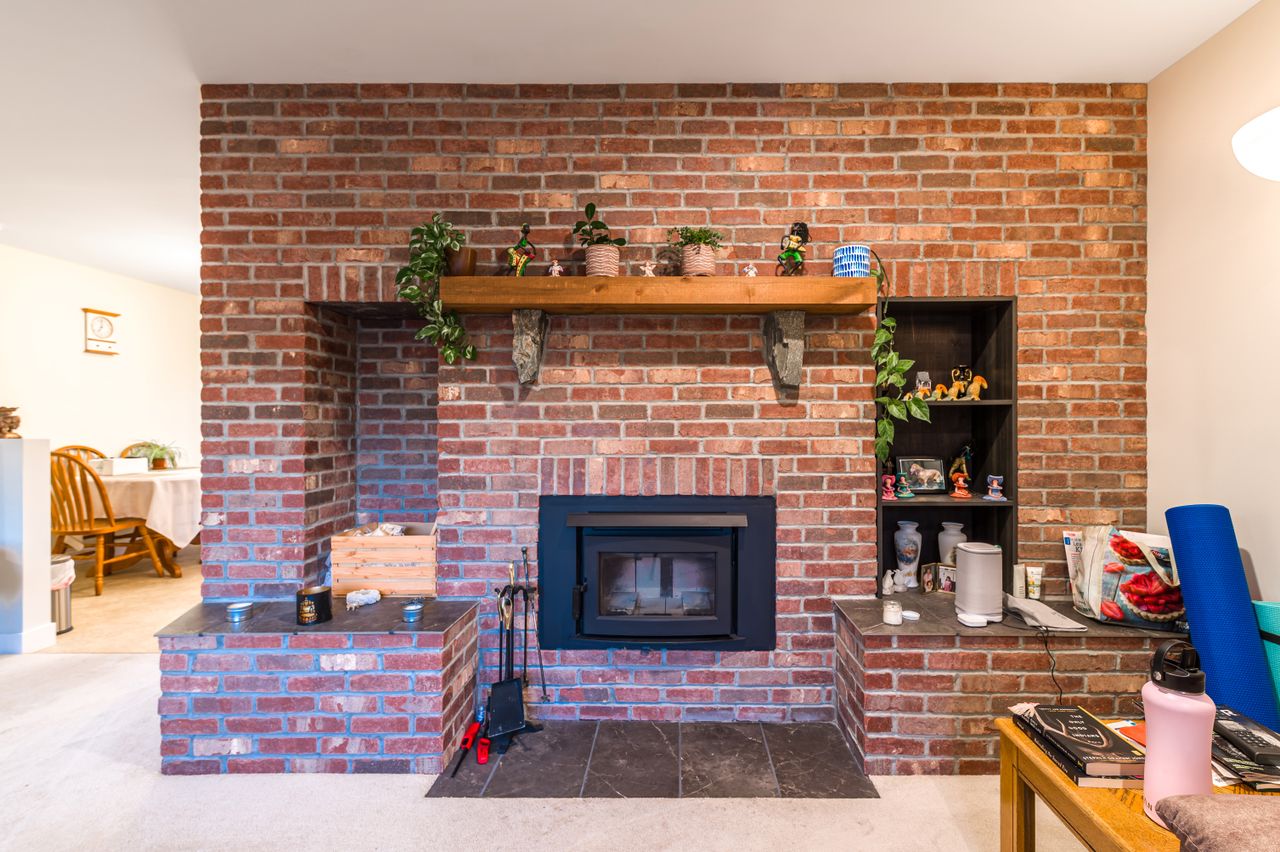 The interior living space boasts a comfortable and functional layout with a large living room featuring a cozy wood-burning fireplace and a well-appointed, open-concept kitchen and dining area complete with shaker-style cabinetry, updated stainless steel appliances, and an abundance of counter and cabinet space for the chef in the family. The primary bedroom, 2 further bedrooms, and a 4-piece bathroom are to the left of the living room while the laundry room and a 3-piece bathroom are to the right.
