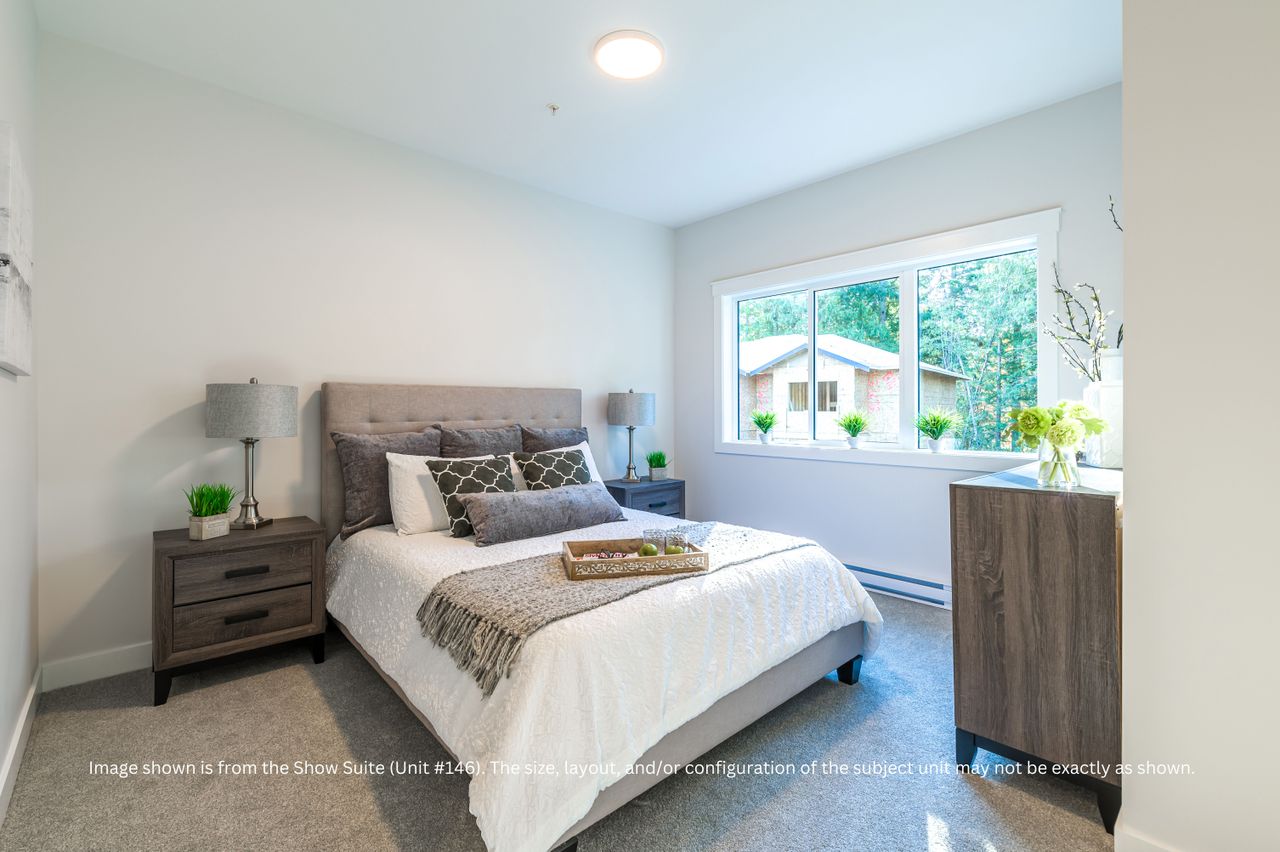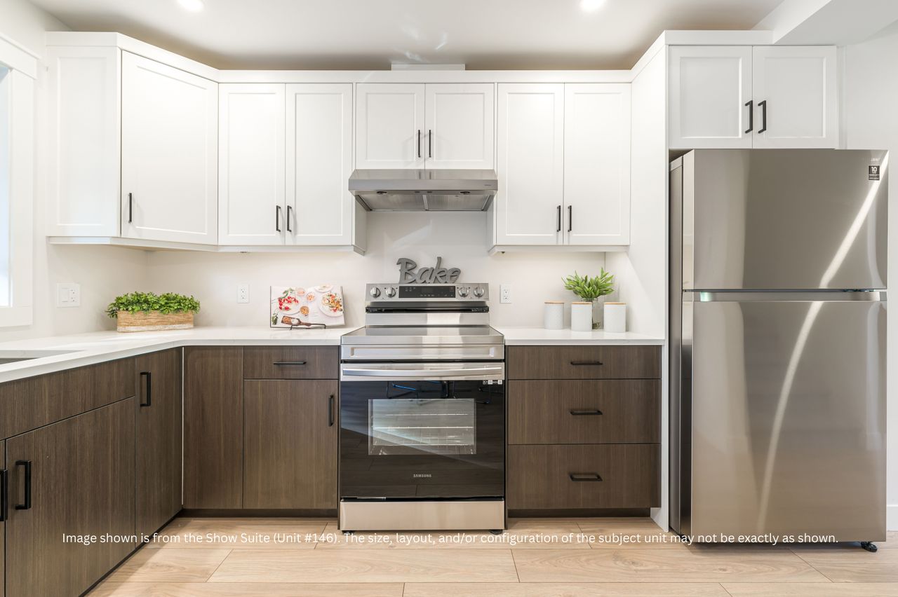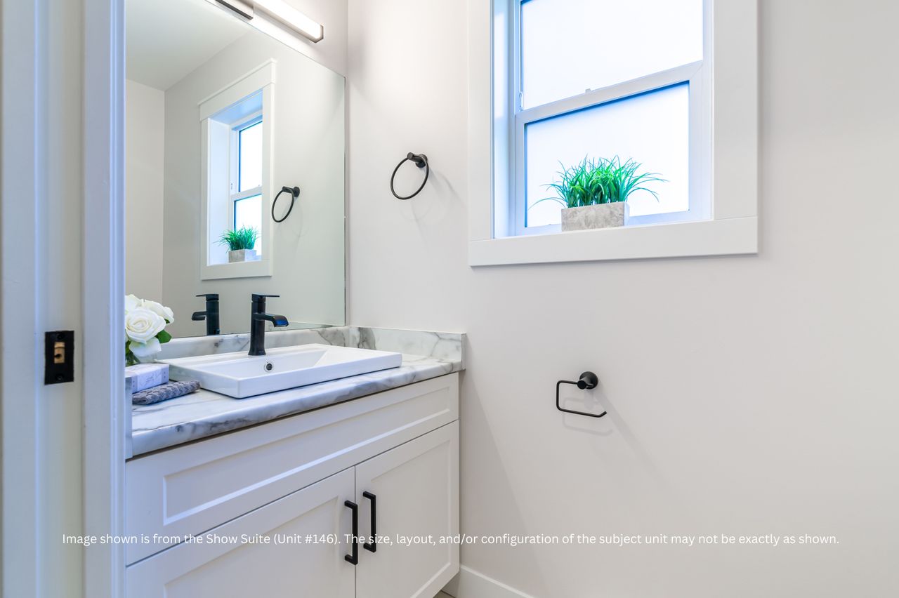 Townhomes at The Southbend boast one of two on-trend finishing packages with unit 132 featuring the Premium Package. Design elements such as matte black hardware, lighting, and kitchen and bathroom fittings and fixtures are found throughout, while the bathrooms feature calacatta marble laminate counters and carrera tile flooring. Wide plank laminate flooring and classic grey carpet flow throughout the rest of the home creating both a contemporary and a comfortable space.