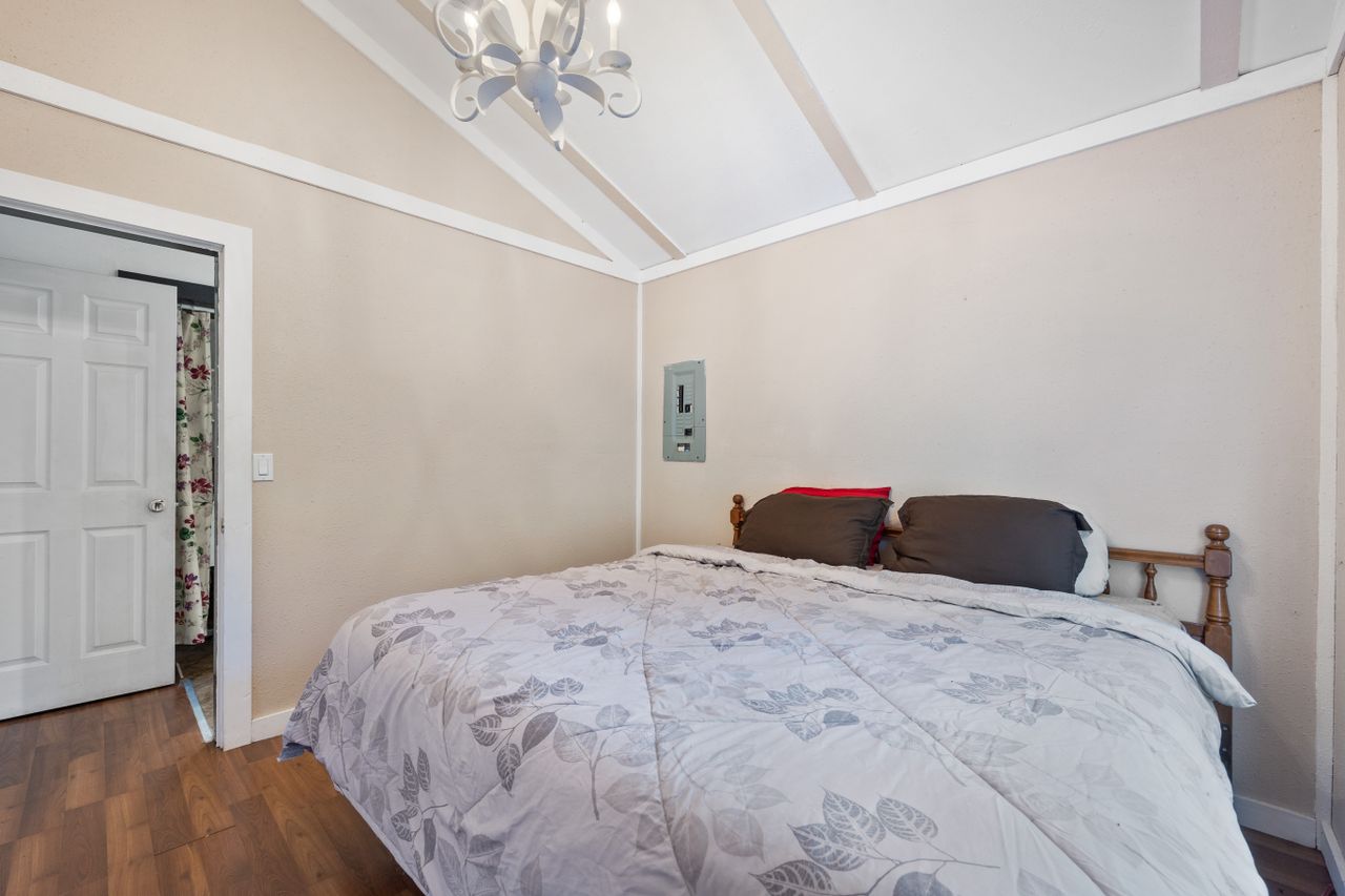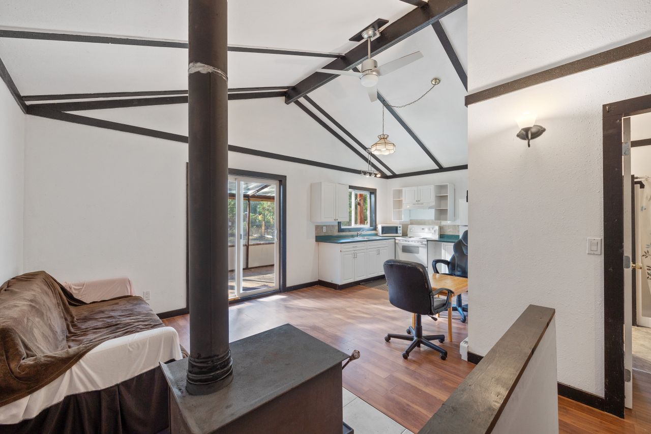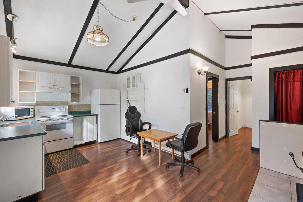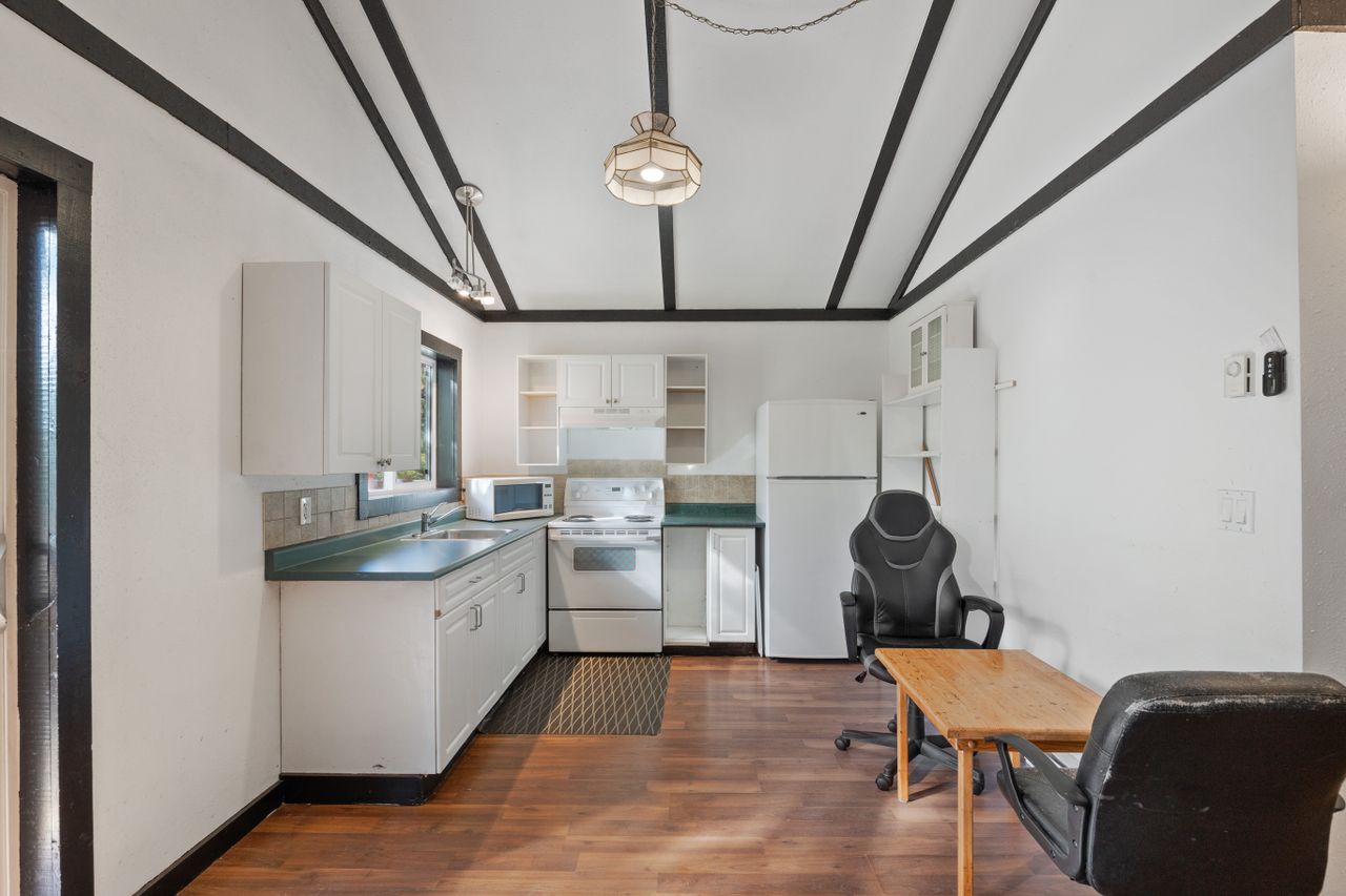 The self-contained guest accommodation enjoys a private setting away from the main residence and offers vaulted ceilings, an open concept living space with a full kitchen, and the potential for two bedrooms, although neither currently has a closet, with the primary enjoying direct access to the main 4-piece bathroom.