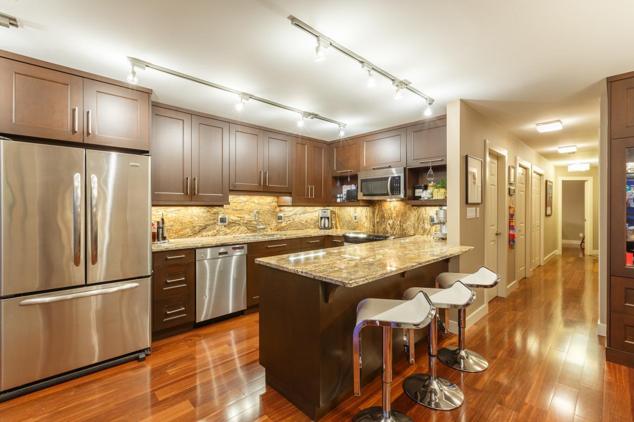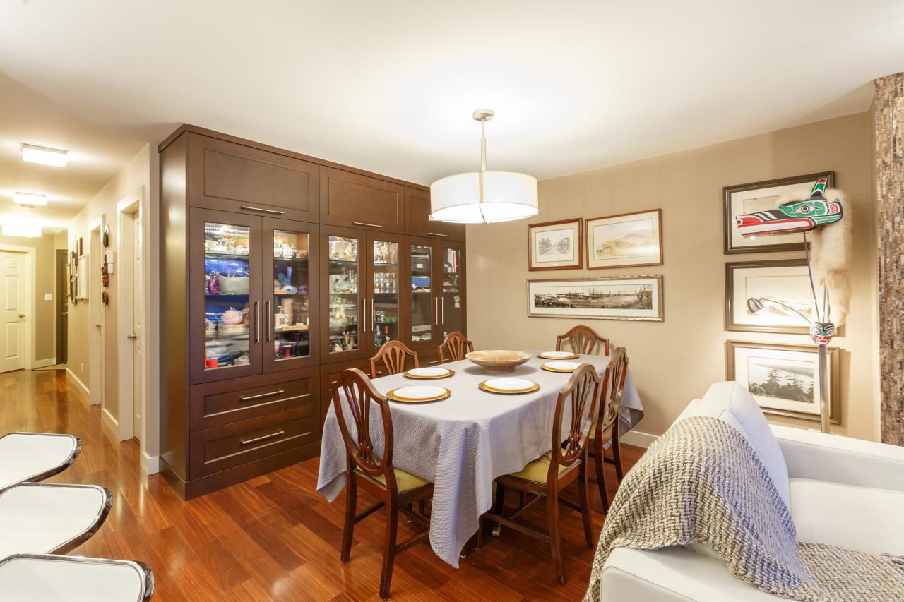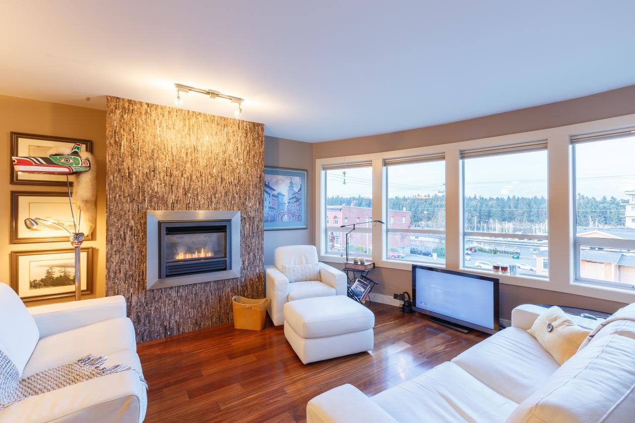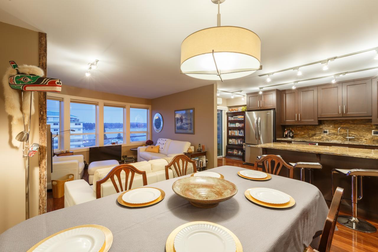 Upon entering this stunning condo, you will immediately be drawn in by the imported Indonesian hardwood flooring, leading you down the hallway to where you will catch your first glimpse of the impressive views of Newcastle Channel and the buzzing Nanaimo Harbour. The main living area, perfectly situated to optimize the magnificent views, features an inviting, open concept design, perfect for entertaining. Updates such as the customized fireplace surround in the living room, and floor-to-ceiling custom cabinetry in the dining room only serve to enhance the ambiance of the unit. The gourmet kitchen is a chef’s dream. With stainless steel appliances, custom cabinets, granite countertops and backsplash, and perfectly situated to be a part of the conversation in the living and dining rooms, preparing meals will surely be a treat! Just off the kitchen, you will find your own private balcony overlooking the harbour. Picture yourself enjoying your morning coffee watching eagles soaring overhead or a pod of orcas passing through Newcastle Channel…