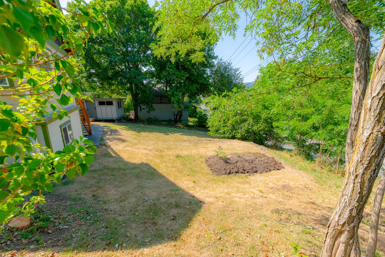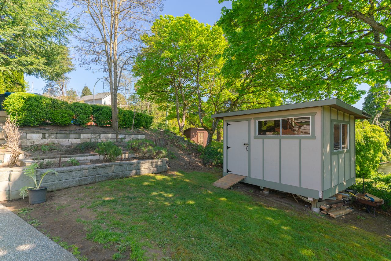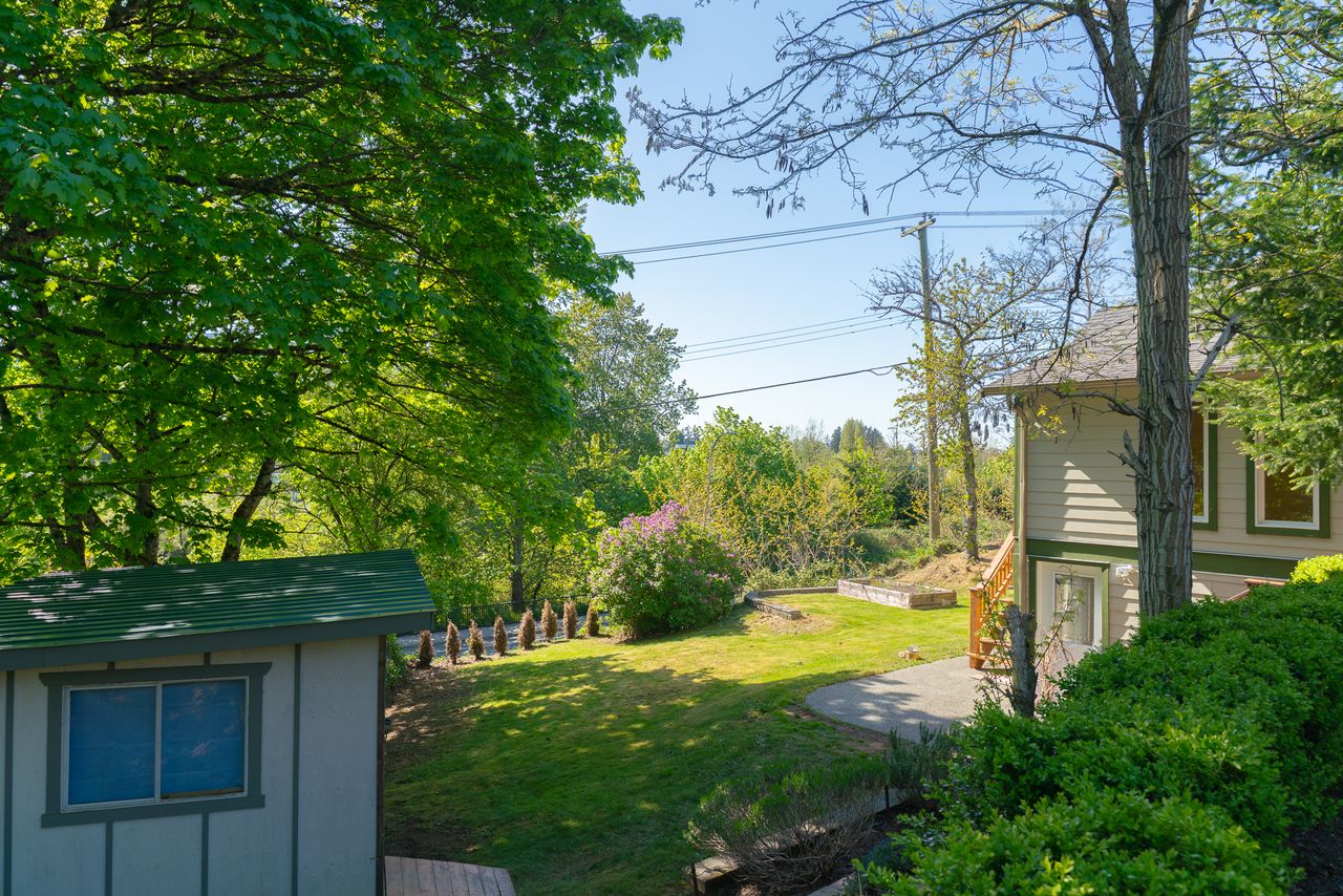 Outside, the property features a private backyard boasting southern exposure and offering a tranquil outdoor space for relaxation, recreation, gardening, and play. A shed provides extra storage while a level, open area near the property entrance is designated for off-street parking.