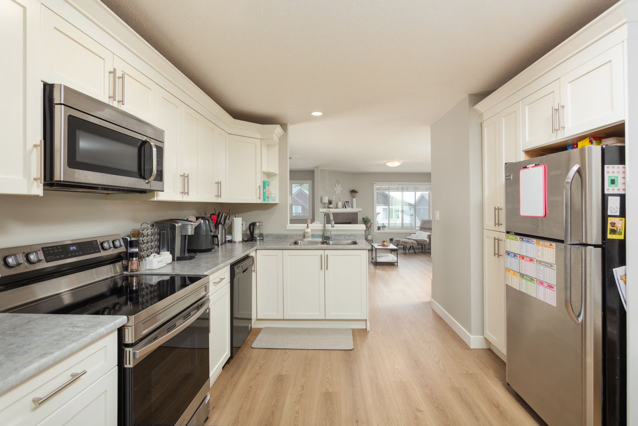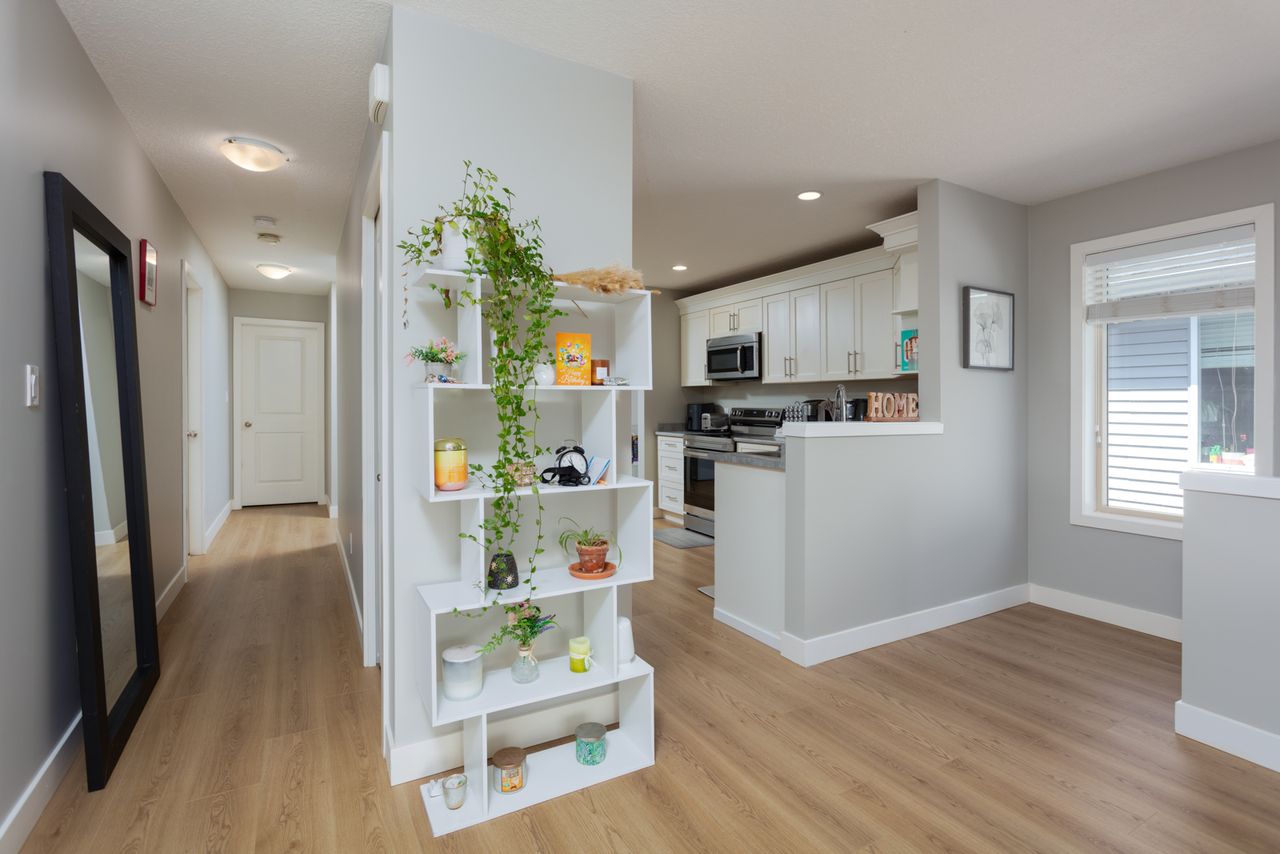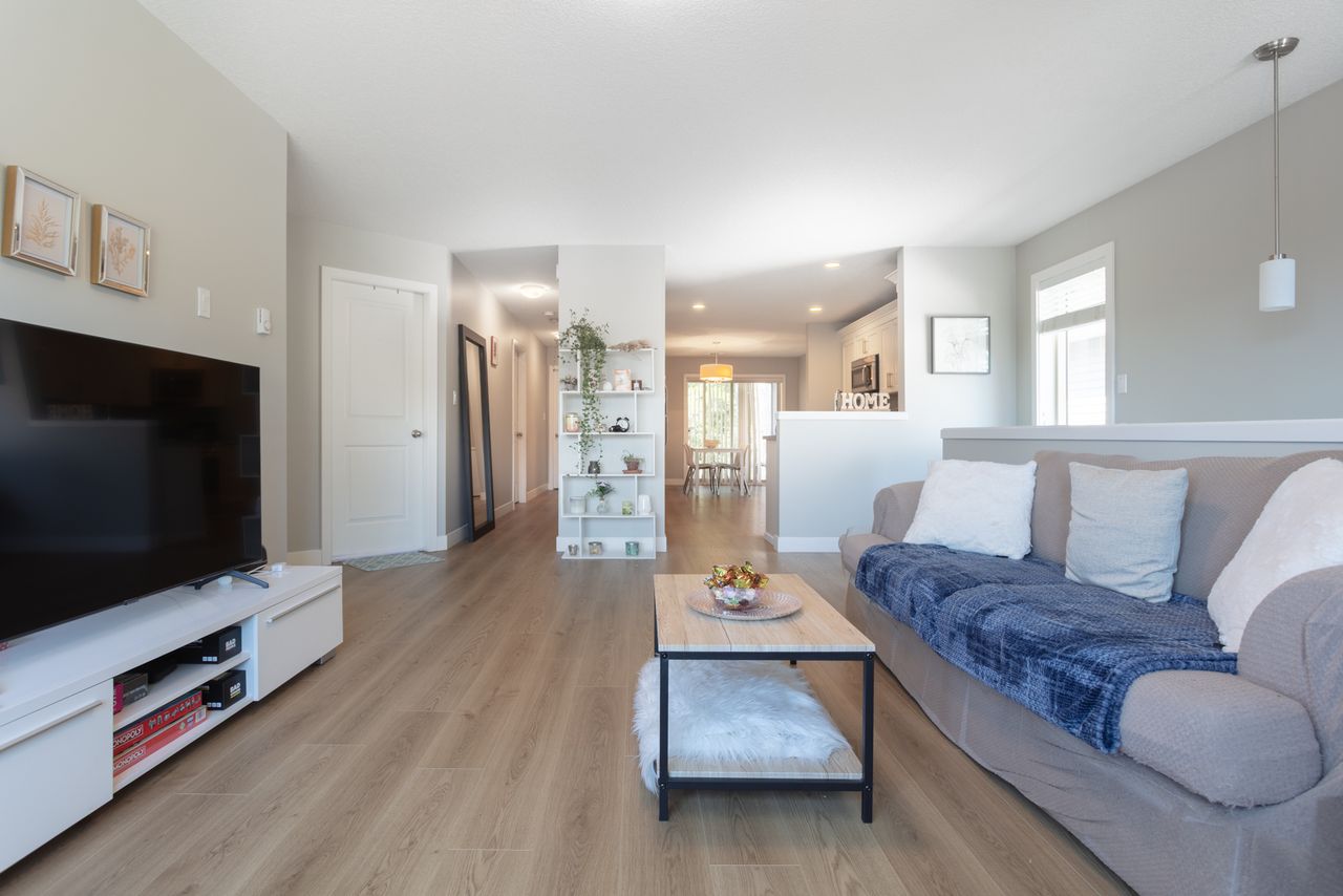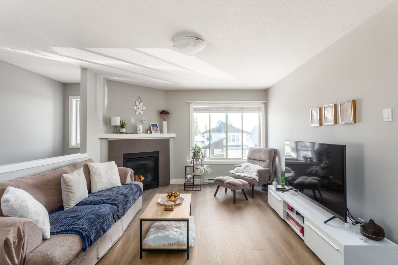 Designed for modern living, the open-concept layout upstairs enhances the feeling of spaciousness and connection, seamlessly integrating the living and dining areas with a bright, well-appointed kitchen with a gas fireplace providing a striking focal point, and adding warmth and ambiance for cozy evenings at home. The primary bedroom, with an ensuite and a walk-in closet, offers a retreat after a long day and is just down the hall from two further bedrooms in this family-friendly layout.
