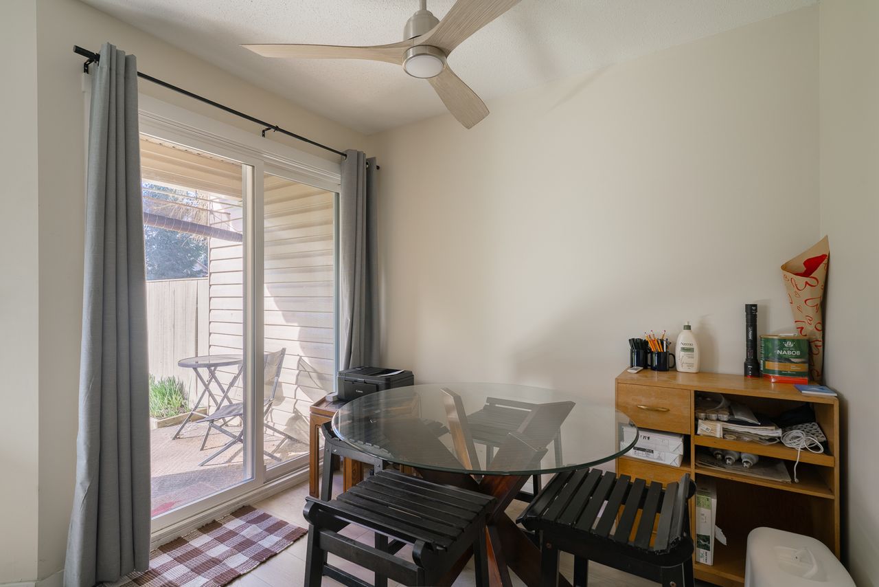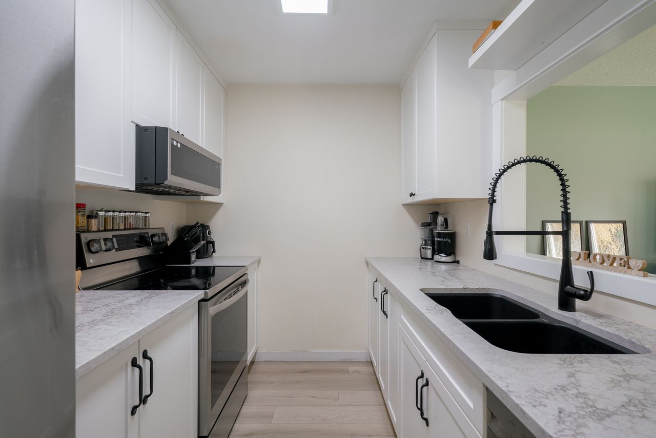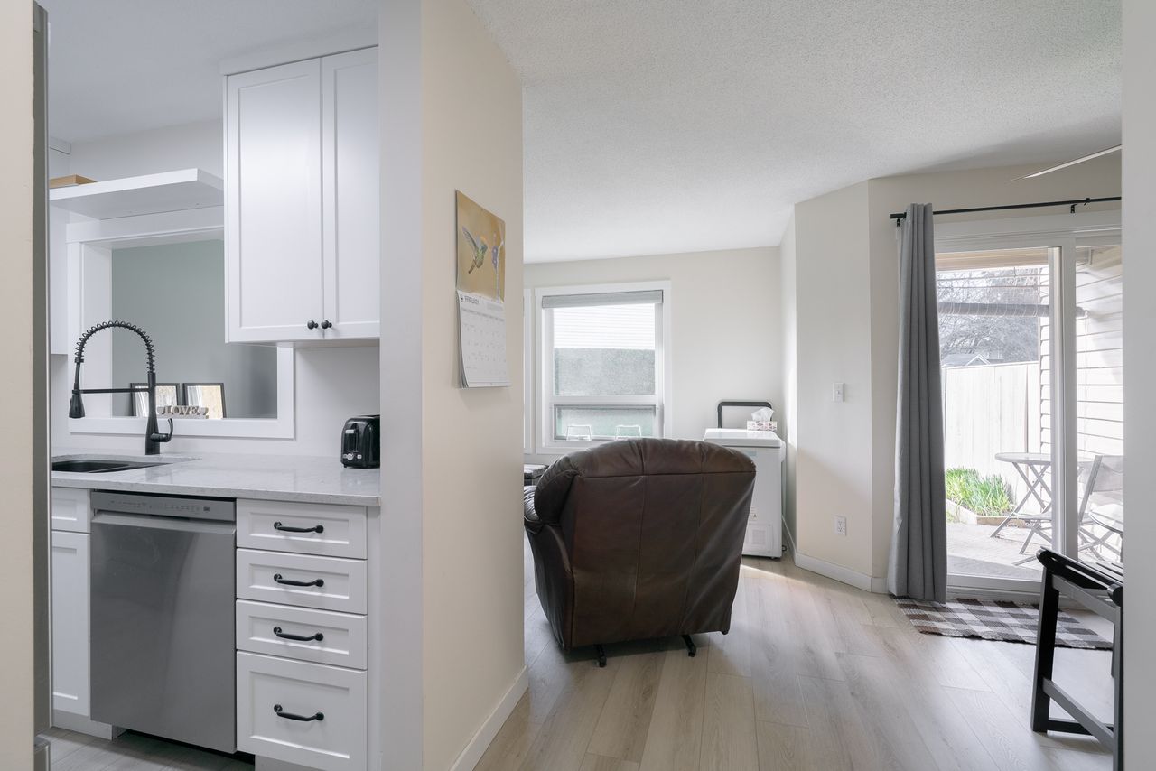 Inside, the home’s thoughtful layout includes two comfortable bedrooms, with the primary offering a walk‑in closet and direct ensuite‑style access to the 4‑piece bath. The modern galley kitchen provides ample counter and cabinet space, and the dining area opens to a private patio—an easy extension of your living space and a lovely spot for morning coffee. Just beyond, a community garden and dog‑friendly Gyro Park, complete with a play area, offer inviting green spaces mere steps from your door.