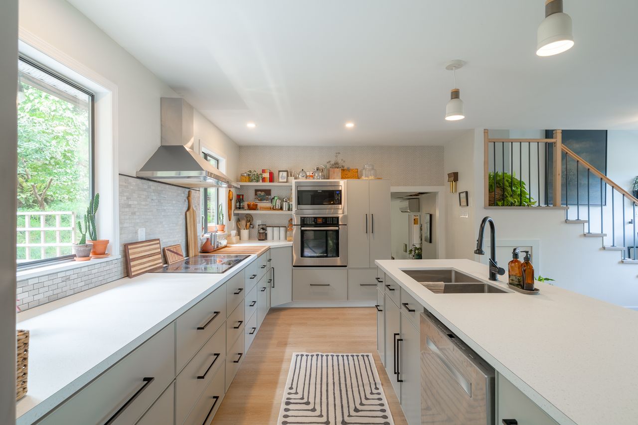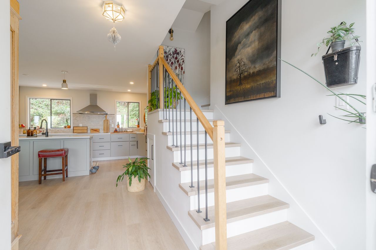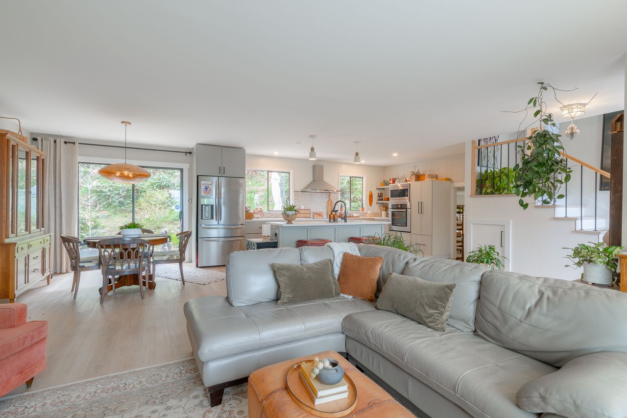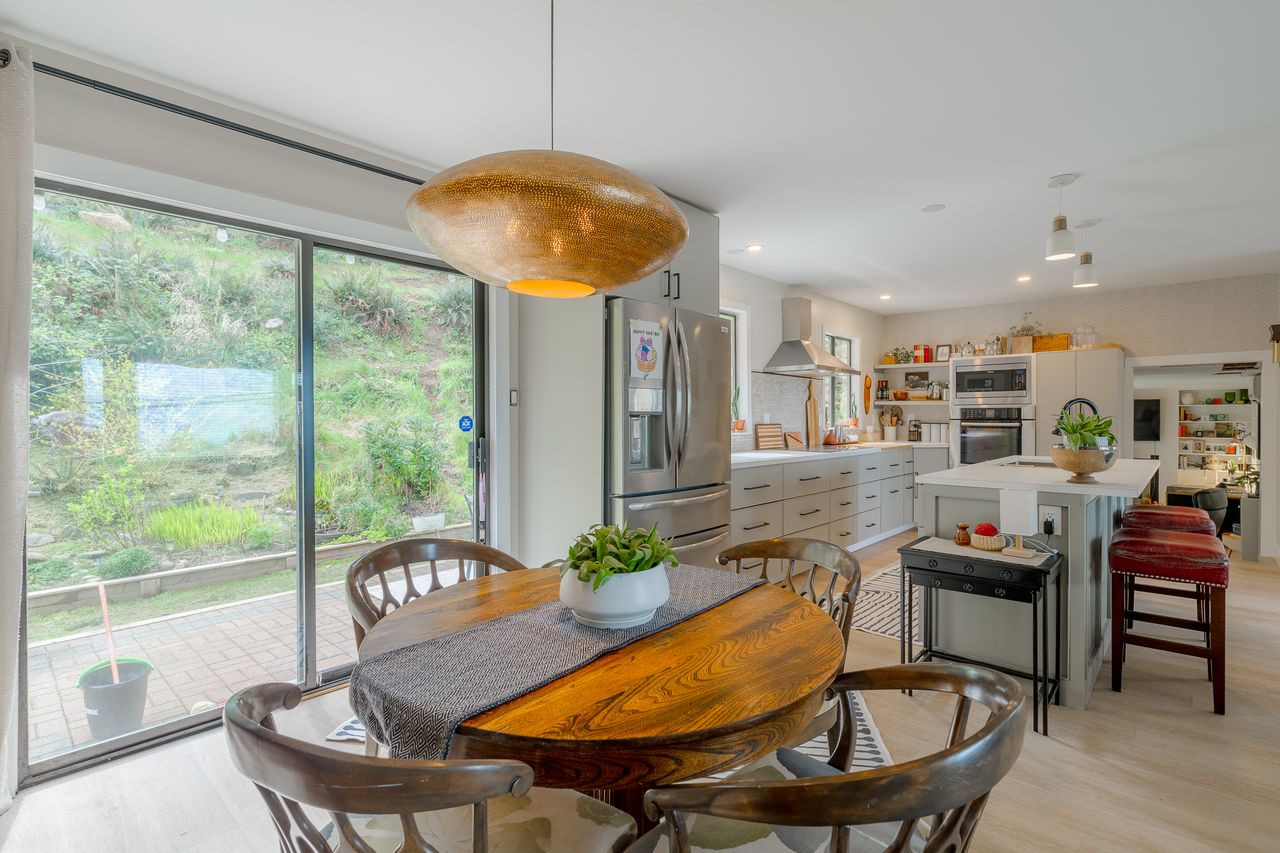 The main level has been extensively refreshed and reimagined into an open‑concept living, dining, and kitchen space that feels bright, airy, and connected. Large windows draw in natural light, while a ductless heat pump enhances comfort year‑round. The modern, tasteful kitchen with high-end Thermador and Bosch appliances is truly the heart of the home and an ideal setting for everyday living or entertaining. Just off the dining area, a patio extends your living space outdoors.