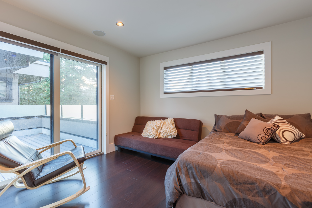 Upstairs features a spacious master suite with built in surround sound, a sizeable walk in closet, a luxurious 4 piece ensuite complete with an oversized glass enclosed shower, a heated floor, quartz counters and dual sinks. The master suite leads to a loft overlooking the main floor living area that is currently used as an office space and which provides access to a cozy rooftop deck with a natural gas stone fireplace, perfect for your morning coffee or for relaxing before bed. Two additional bedrooms and a stylish 5 piece bathroom featuring an underfloor heating system and quartz countertops complete the upper level of this home while additional accommodation is offered in a nanny suite located above the garage and which includes a well outfitted kitchen and 3 piece bathroom that boasts the same high end finishes as the main residence as well as plumbing and wiring ready for laundry facilities.