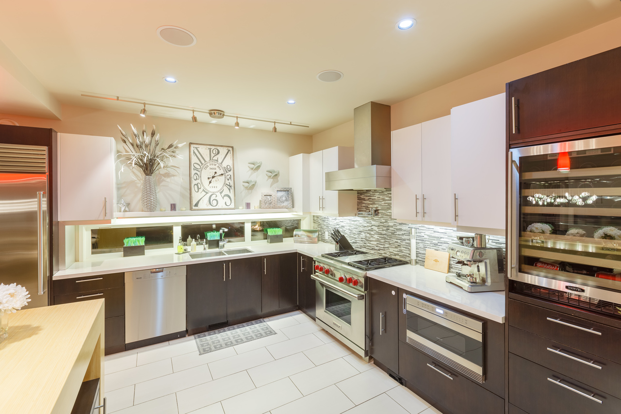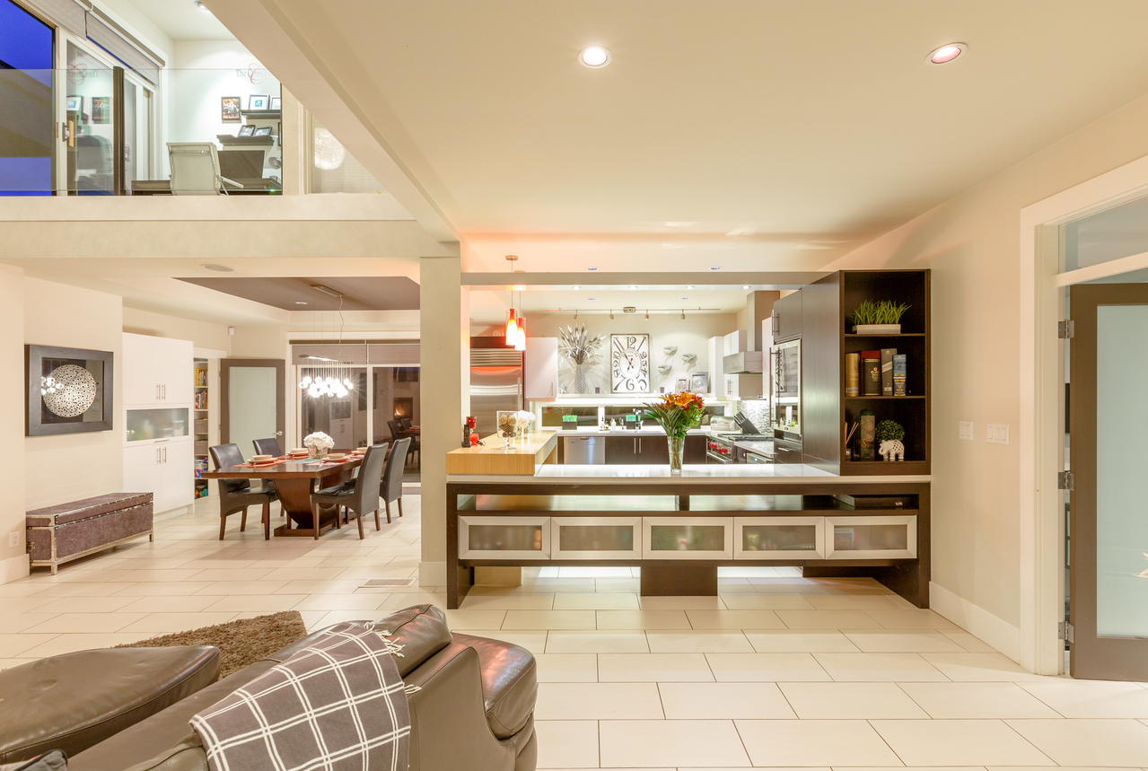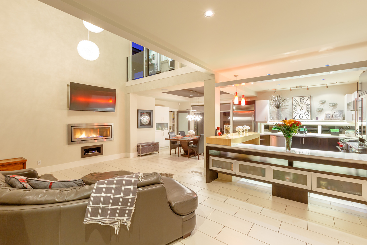 As you enter the front door of the home you will be struck by the bright and airy feel of the open concept floor plan which features a sizeable living space with 18’ ceilings, full height windows and a modern natural gas fireplace that seamlessly flows into the elegant dining area. With a recessed ceiling it is an entertainer’s dream, the perfect venue for an intimate family get together but with enough space to host a large dinner party, using the 5 zone audio system to set the mood, and with access to the back yard to extend the living space. Separated from the dining area by a counter with bar stools for extra seating is the state of the art, gourmet kitchen. Featuring high end Wolf/Subzero appliances and a wine fridge, an instant boiling hot tap and a pot filler at the kitchen sink, underfloor heating, quartz countertops, and an abundance of cabinets, this space is a chef’s dream! To the right of the main living area, separated by double glass doors in its own wing is an impressive sunken media room with enough wall space for multiple TVs to satisfy the sports enthusiast and featuring built in surround sound and a custom made, 12-seater leather sectional designed specifically for, and staying with, this space - perfect for movie night. Also situated in this area of the home is a 3 piece bathroom featuring quartz counters and top of the line fixtures and fittings found in all bathrooms in the home, while laundry facilities and storage are located off the dining area.