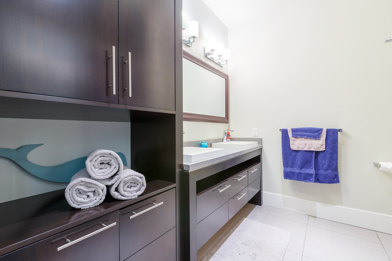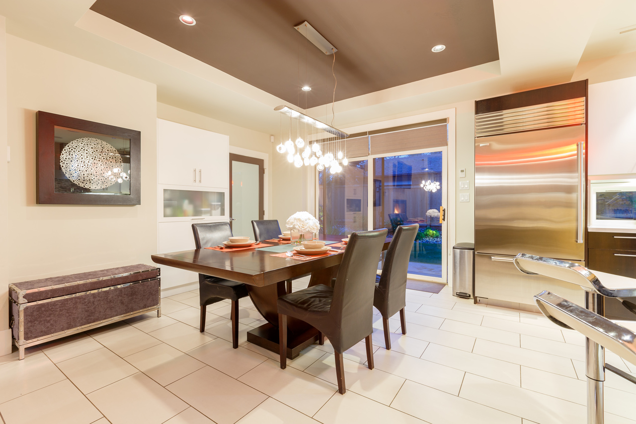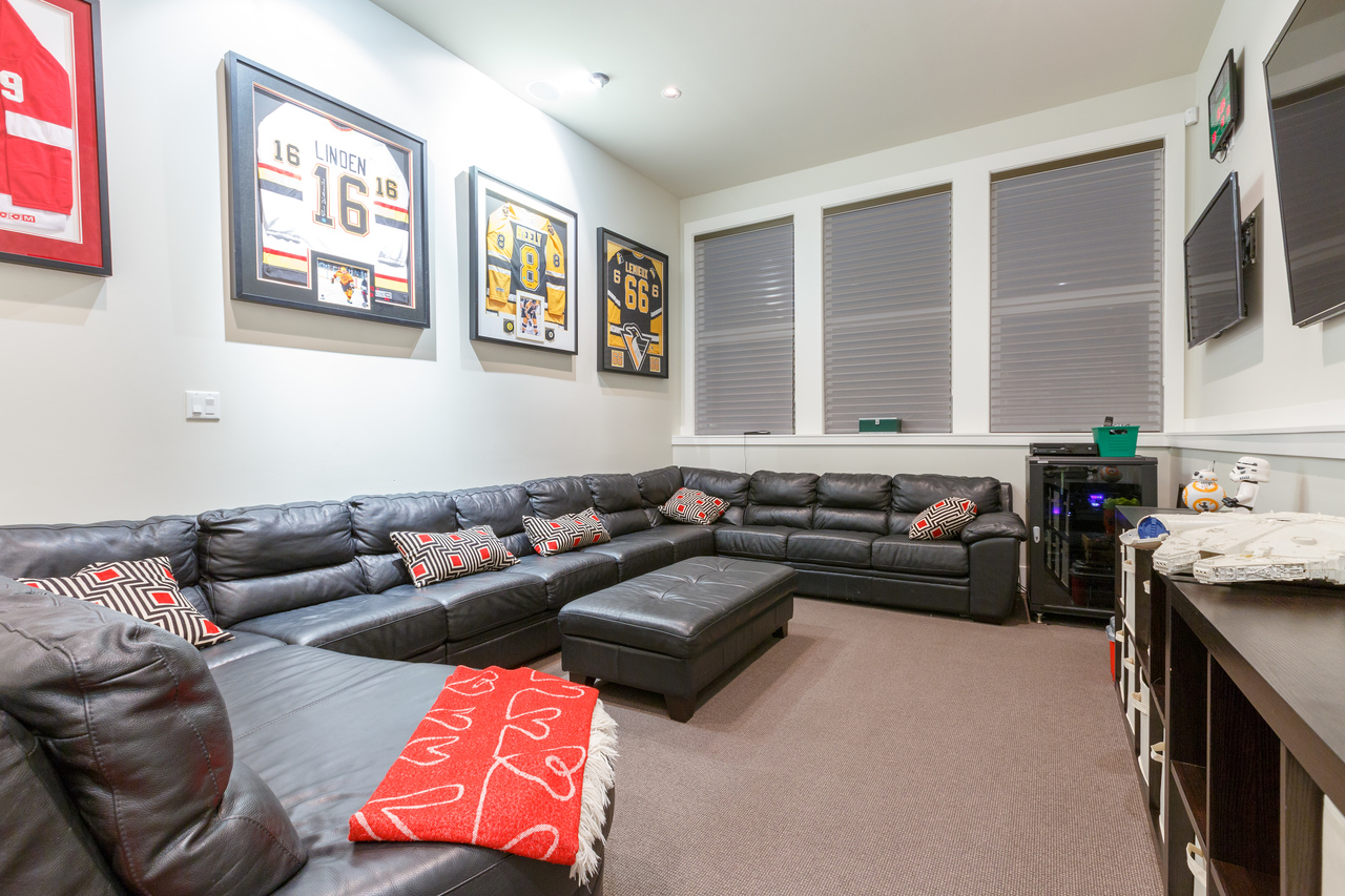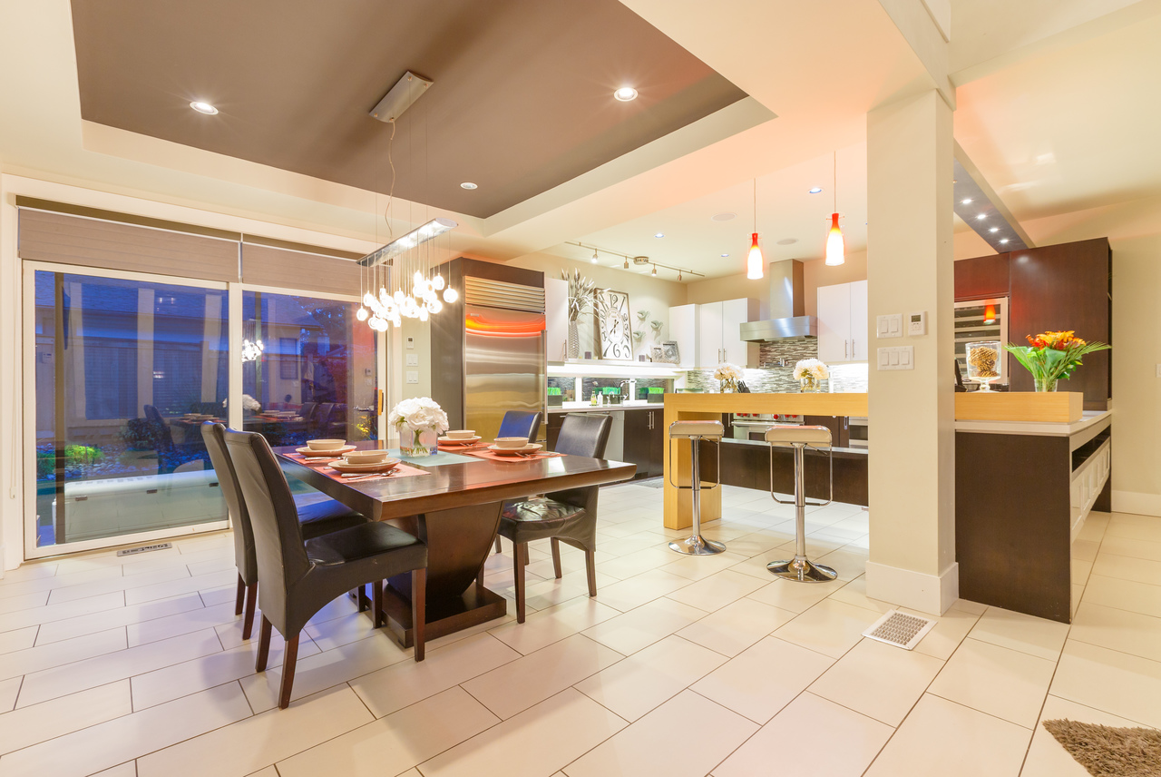 As you enter the front door of the home you will be struck by the bright and airy feel of the open concept floor plan which features a sizeable living space with 18’ ceilings, full height windows and a modern natural gas fireplace that seamlessly flows into the elegant dining area. With a recessed ceiling it is an entertainer’s dream, the perfect venue for an intimate family get together but with enough space to host a large dinner party, using the 5 zone audio system to set the mood, and with access to the back yard to extend the living space. Separated from the dining area by a counter with bar stools for extra seating is the state of the art, gourmet kitchen. Featuring high end Wolf/Subzero appliances and a wine fridge, an instant boiling hot tap and a pot filler at the kitchen sink, underfloor heating, quartz countertops, and an abundance of cabinets, this space is a chef’s dream! To the right of the main living area, separated by double glass doors in its own wing is an impressive sunken media room with enough wall space for multiple TVs to satisfy the sports enthusiast and featuring built in surround sound and a custom made, 12-seater leather sectional designed specifically for, and staying with, this space - perfect for movie night. Also situated in this area of the home is a 3 piece bathroom featuring quartz counters and top of the line fixtures and fittings found in all bathrooms in the home, while laundry facilities and storage are located off the dining area.