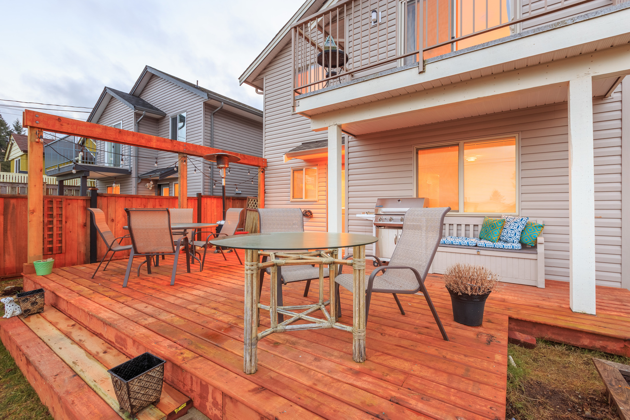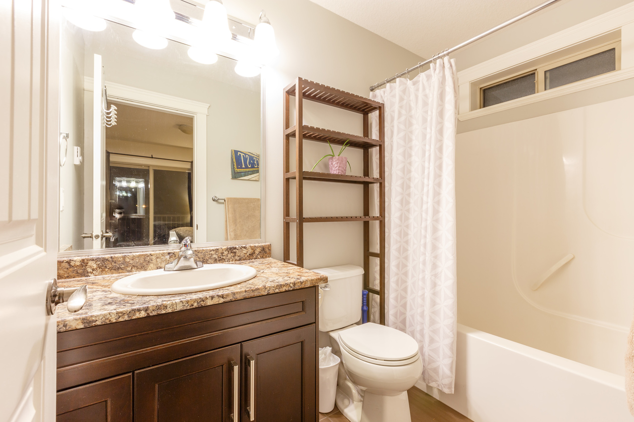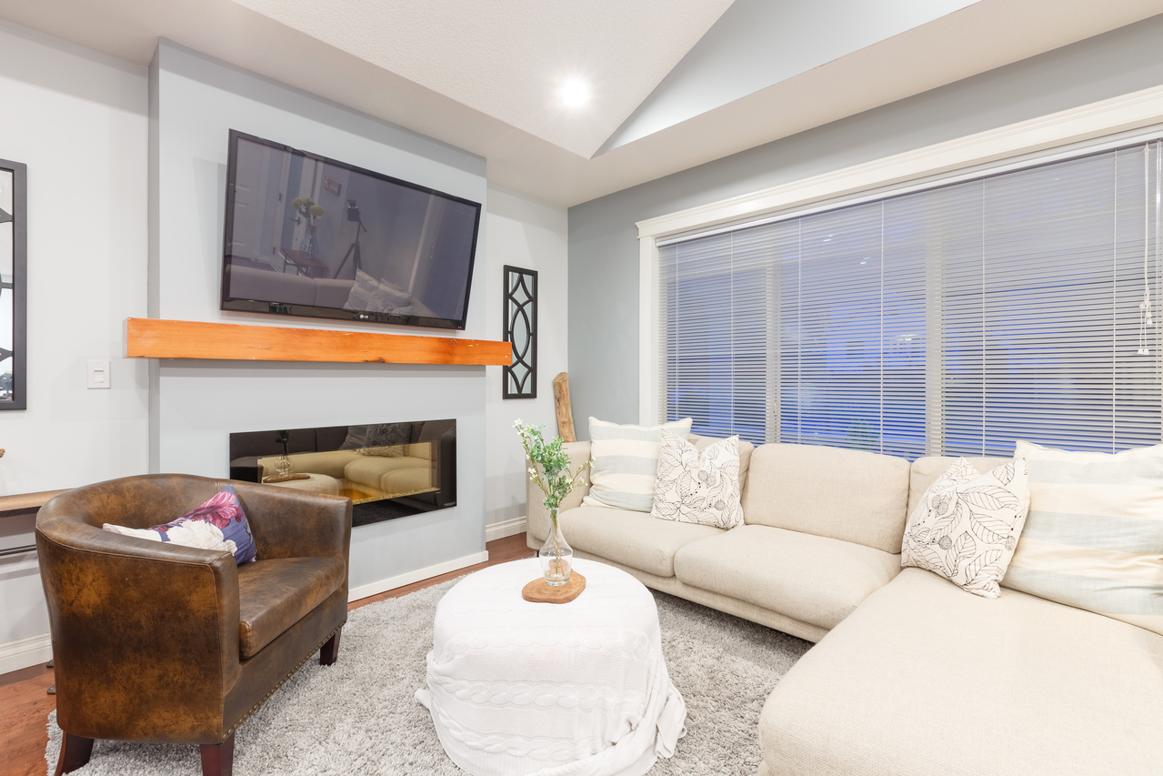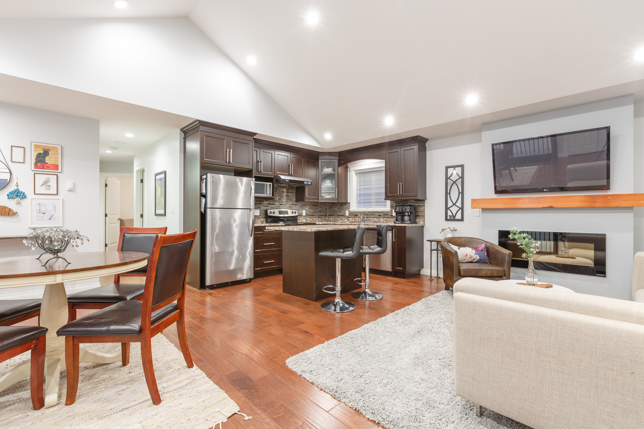 Upon entering the home, you will be struck by the tasteful decor and contemporary finishes accentuated by the open concept floor plan with engineered hardwood throughout and vaulted ceilings creating a spacious and bright, well defined space equally well suited to entertaining as it is to family time. The kitchen features dark maple cabinetry, stainless steel appliances and a breakfast bar while the focal point of the cosy living and dining area is the fireplace which enhances the visual ambiance. Towards the rear of the main floor is the master with a slider accessing a private deck overlooking the backyard and a tasteful 4-piece ensuite, while two further bedrooms and a 4-piece family bathroom round off the main floor.