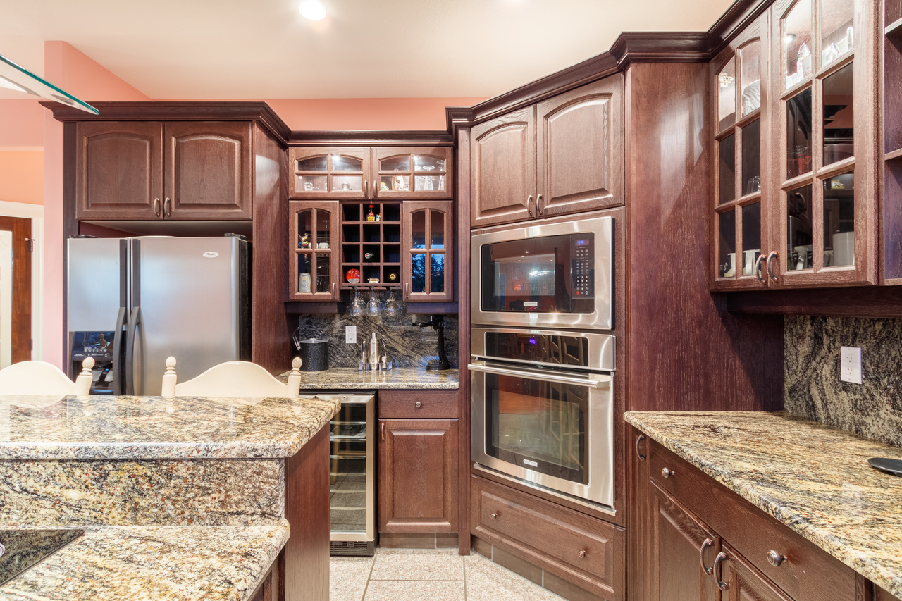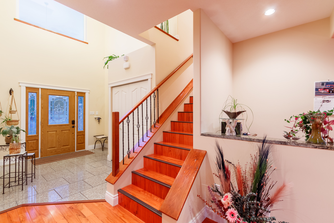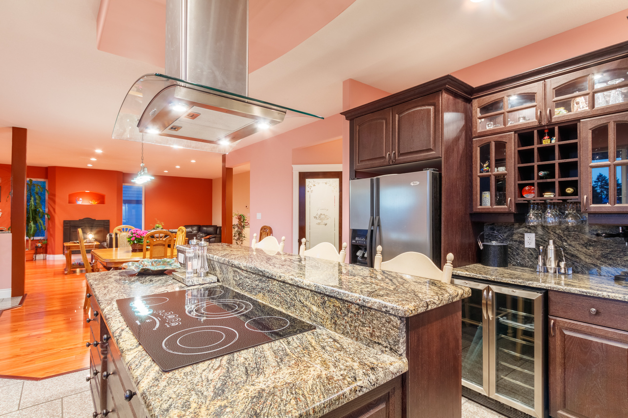 The bright foyer with 18’ ceilings welcomes you to the main floor and through to the open concept sitting area with a cozy gas fireplace and large windows capturing the serenity of the treed backdrop. The dining area follows and provides access to the covered, wrap around deck, the perfect viewpoint to take in the sunset or for BBQs whatever the weather. The custom kitchen with soft-close cabinet doors, granite floors & counters, an island/eating bar and pantry are sure to please any caliber of chef. A den and a 3 piece bathroom with jetted tub complete the main level.