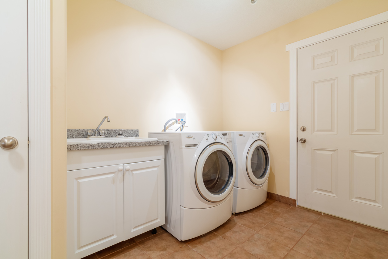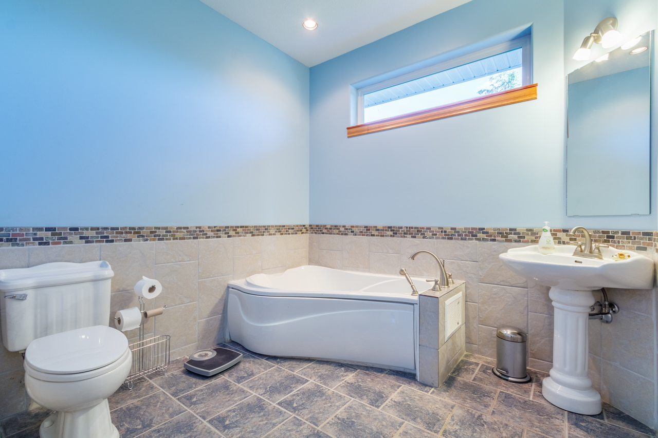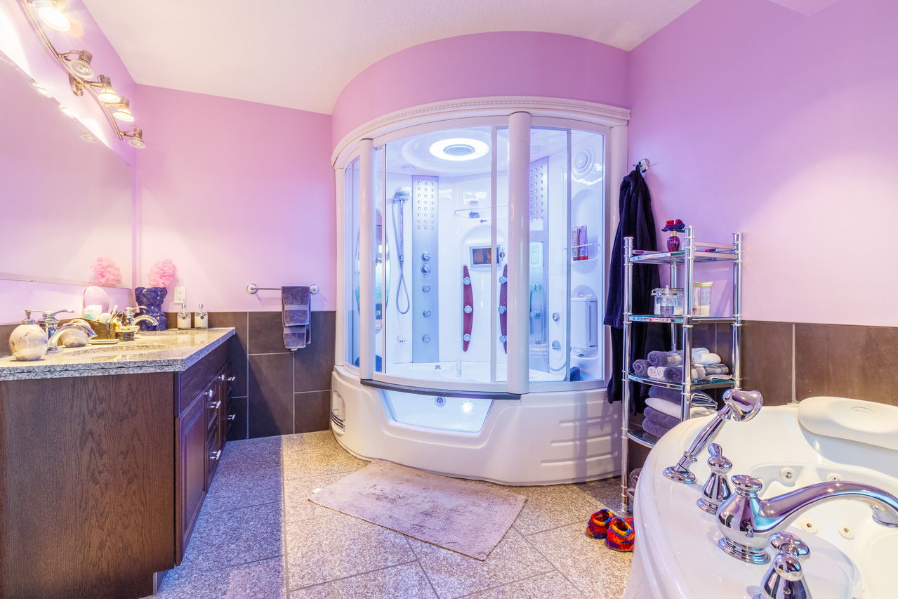 Upstairs offers a master retreat with a bright bedroom area comprising of 10’ vaulted ceilings with skylights and large windows to maximise the natural light, access to the upper deck, a large walk-in closet and a spa-like 6 piece ensuite with heated granite floors, dual sinks, a 2 person jetted tub and a remote-controlled steam shower complete with a radio and wired for a DVD player. 2 further bedrooms, a 4 piece family bathroom with granite floors, and a spacious laundry room round off the upstairs.