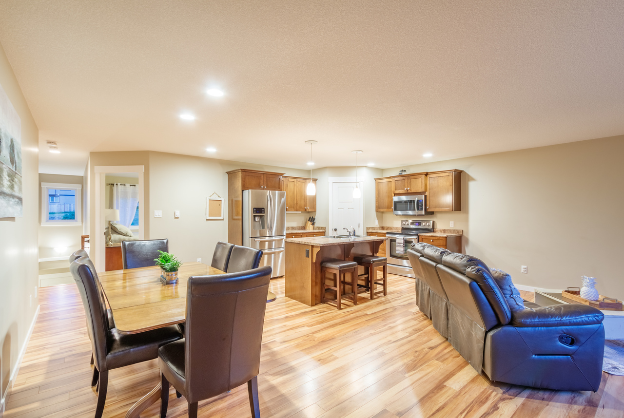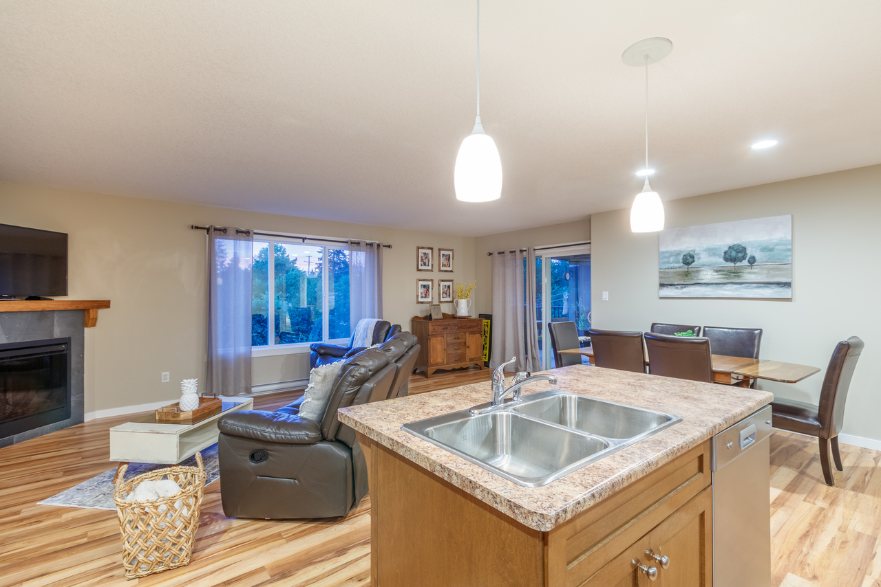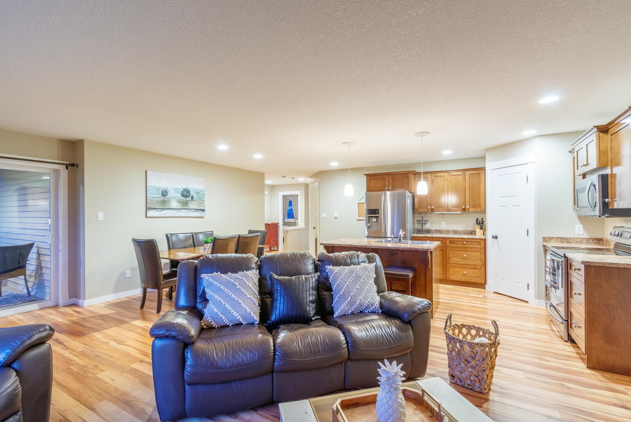 The functional, open concept main floor living and dining space with an abundance of natural light features a sitting area with a corner fireplace for cozy nights at home, access to the covered deck for all year round BBQs, and a dining space that would comfortably seat a family dinner or a larger gathering, The new owners will also surely appreciate the well-appointed kitchen boasting shaker-style cabinets, stainless steel appliances, an island with an eating bar and a walk-in pantry, making meal preparation a treat.