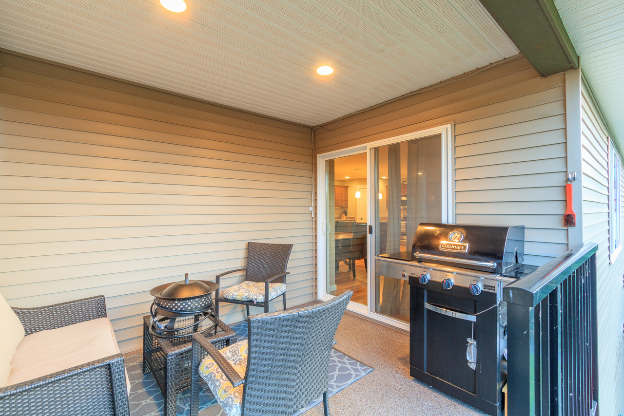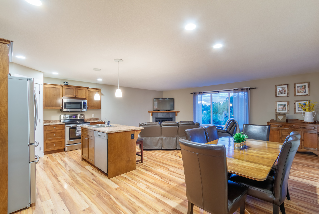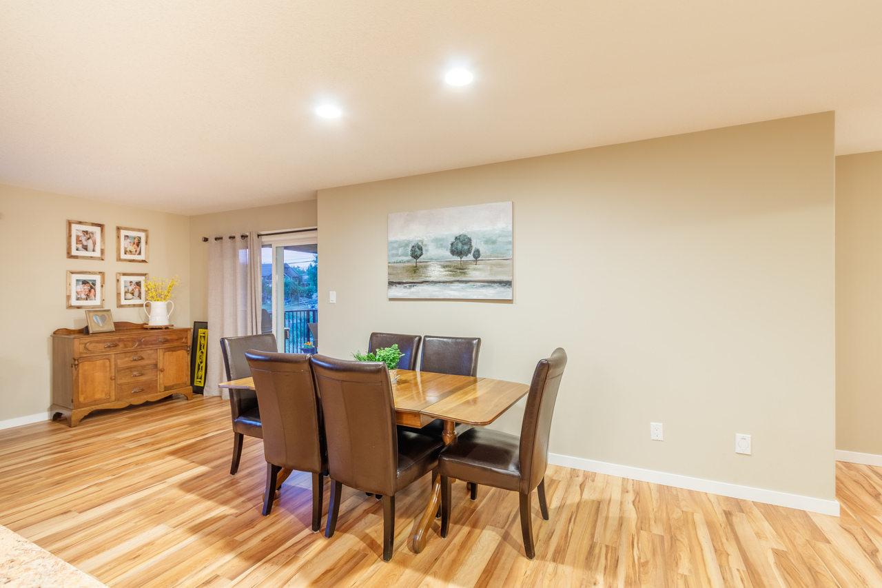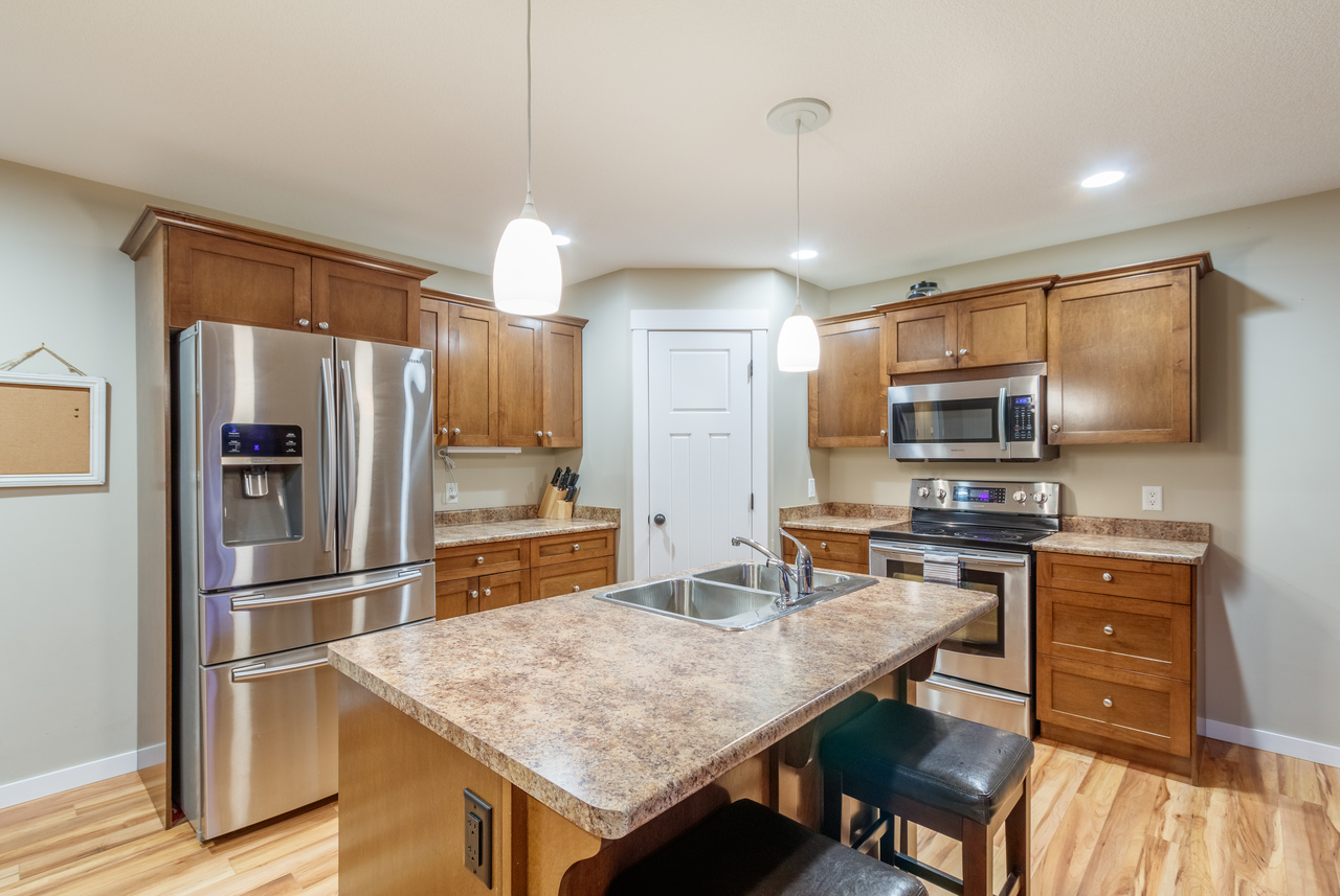 The functional, open concept main floor living and dining space with an abundance of natural light features a sitting area with a corner fireplace for cozy nights at home, access to the covered deck for all year round BBQs, and a dining space that would comfortably seat a family dinner or a larger gathering, The new owners will also surely appreciate the well-appointed kitchen boasting shaker-style cabinets, stainless steel appliances, an island with an eating bar and a walk-in pantry, making meal preparation a treat.