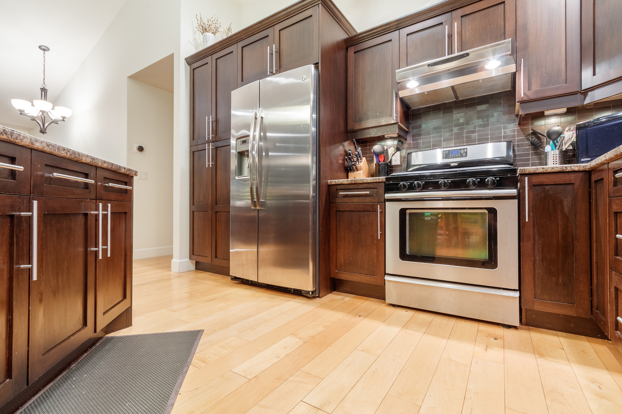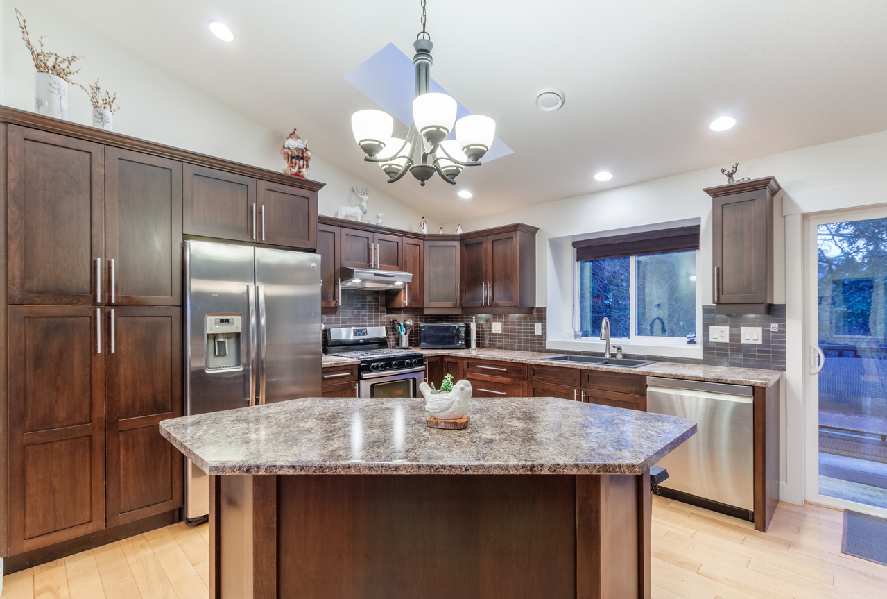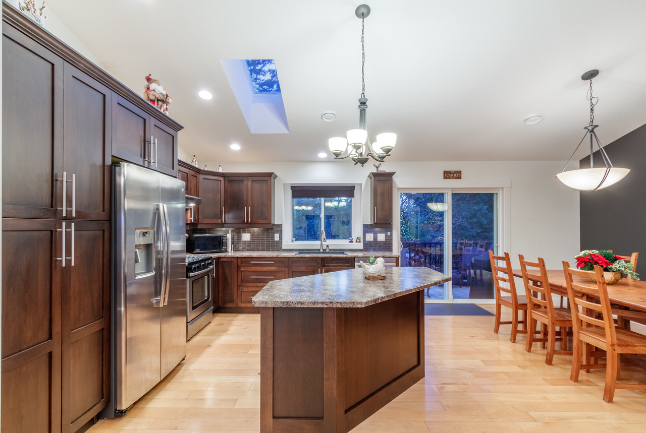 You will appreciate the airy, open concept living/dining space tastefully finished and featuring vaulted ceilings, large windows and skylights, hardwood flooring, and a gas fireplace for cooler evenings with a heat pump offering year-round climate control. As an extension of the living area, the generously-sized front and rear decks, accessed from this space, are perfect for entertaining or for everyday use, while the dining area would comfortably seat a growing family or a large gathering and flows through to the well-appointed kitchen boasting shaker cabinets, stainless steel appliances, an island with an eating bar, and plenty of room for the chef in the family.