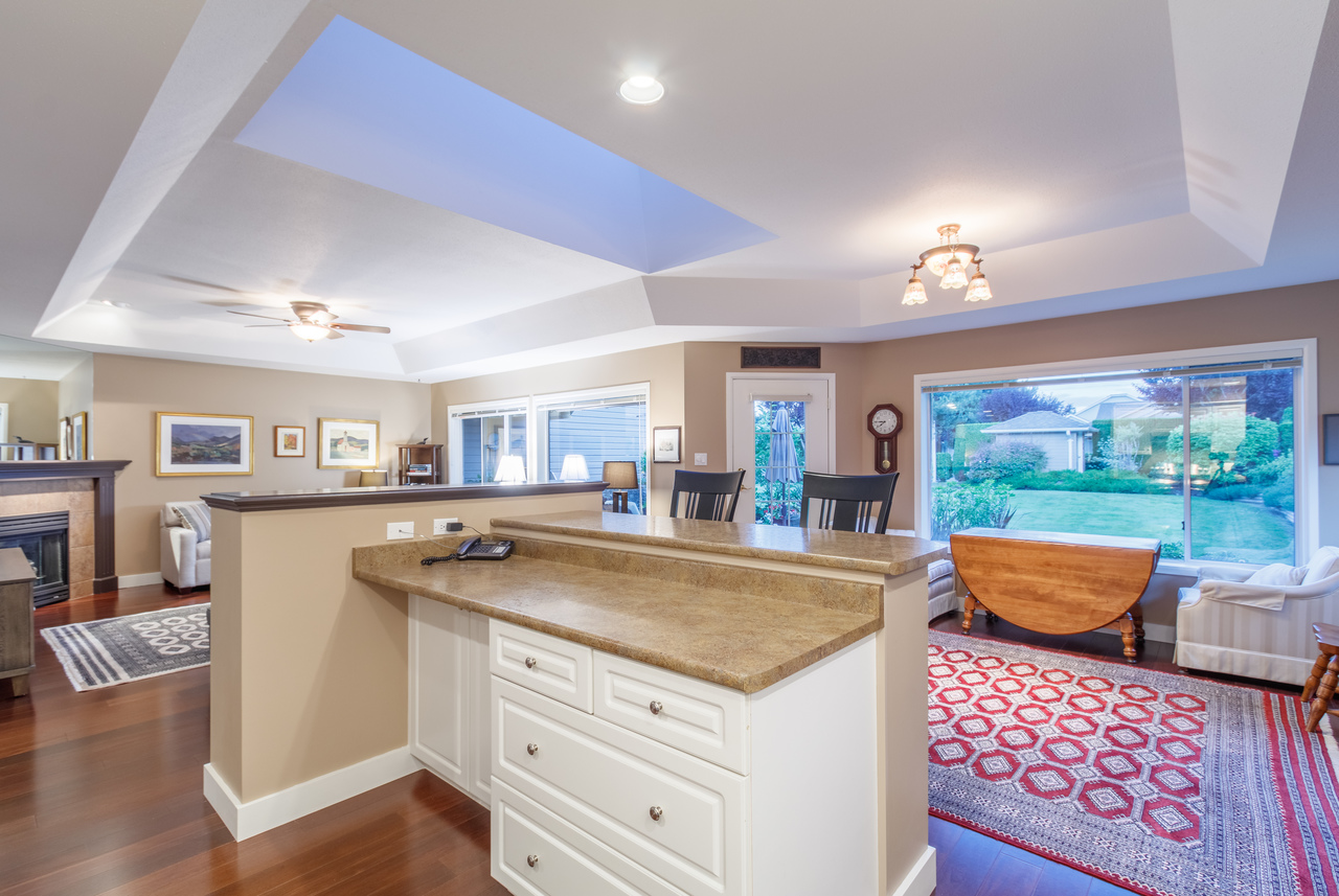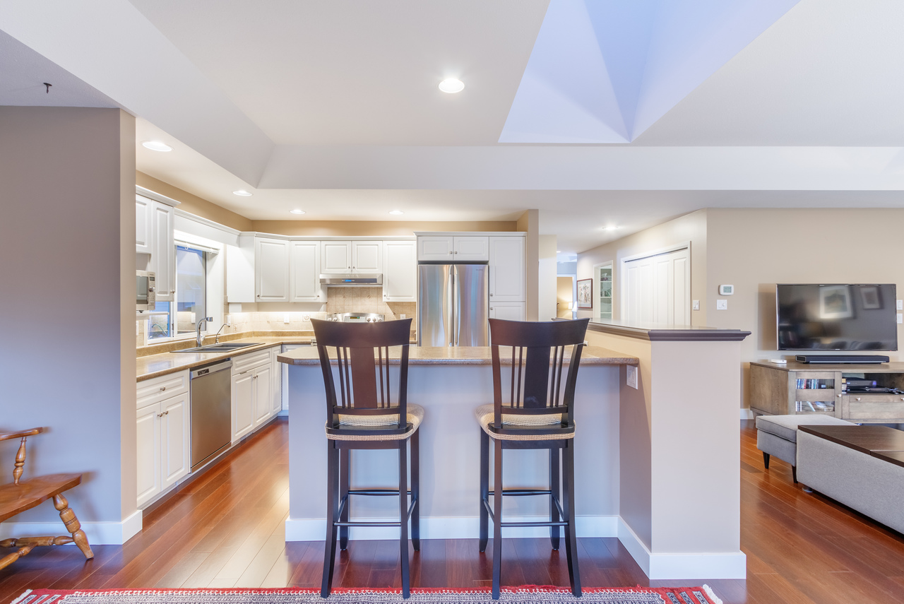 The bright entrance draws you into this spacious home which offers two bedrooms, two bathrooms and 1,422 sqft of functional open concept living space featuring 9' ceilings, a wall of windows and strategically placed skylights that soak the space in natural light, engineered hardwood flooring, and a cozy gas fireplace, the perfect complement to a cooler evening. The well-designed kitchen boasts ample cabinet and counter space, stainless steel appliances, and convenient access to extra pantry storage in the large hallway closet, making meal preparation a pleasure for the chef in the family and ensuring they will never be far from their guests. An eating bar, the ideal spot for morning coffee or a light lunch, separates the kitchen from the roomy dining area, as equally well suited to an intimate dinner for two as it would be for a larger family gathering over the holidays, with a French door leading to the private patio. An extension of the living area backing on to manicured green space and framed by beautiful flower borders, this patio area is the only outdoor space in the complex that is not overlooked.