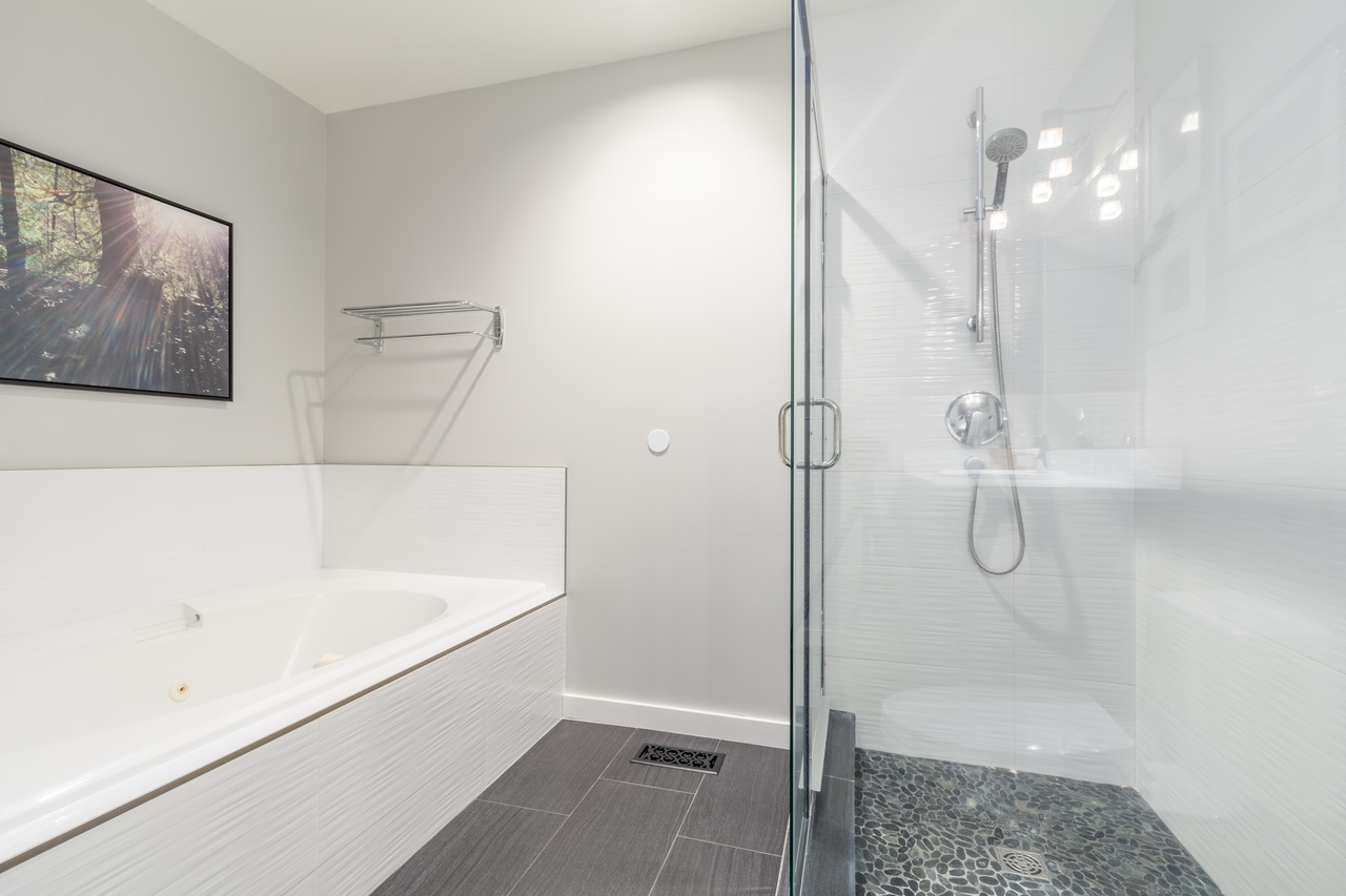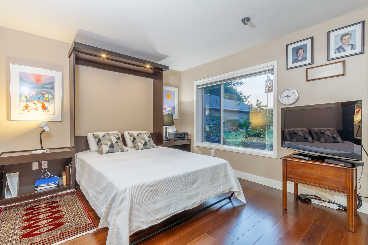 To the left of the main entrance, the master suite features a walk-in closet and an airy 4-piece ensuite complete with heated floors, a separate shower, and a luxurious jetted soaker tub the perfect place to unwind at the end of a long day. The second bedroom complete with wall bed provides a versatile space ideal for overnight guests or for a home office/hobby room and is just steps from the main 3-piece bathroom with access to the spacious laundry and utility room, home to the water purification system and extra storage, while the garage, just off the front walkway, ensures there is plenty of room for everyone's toys.