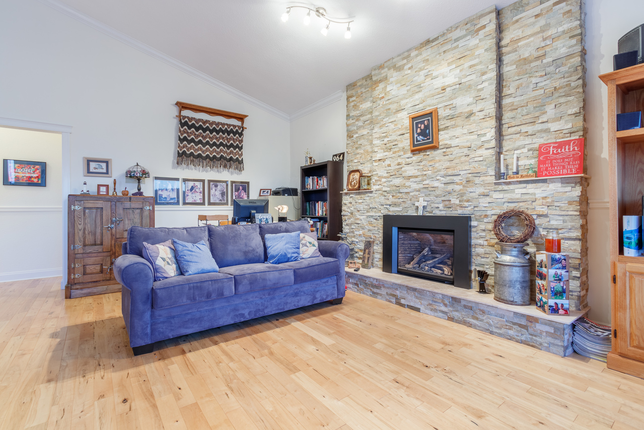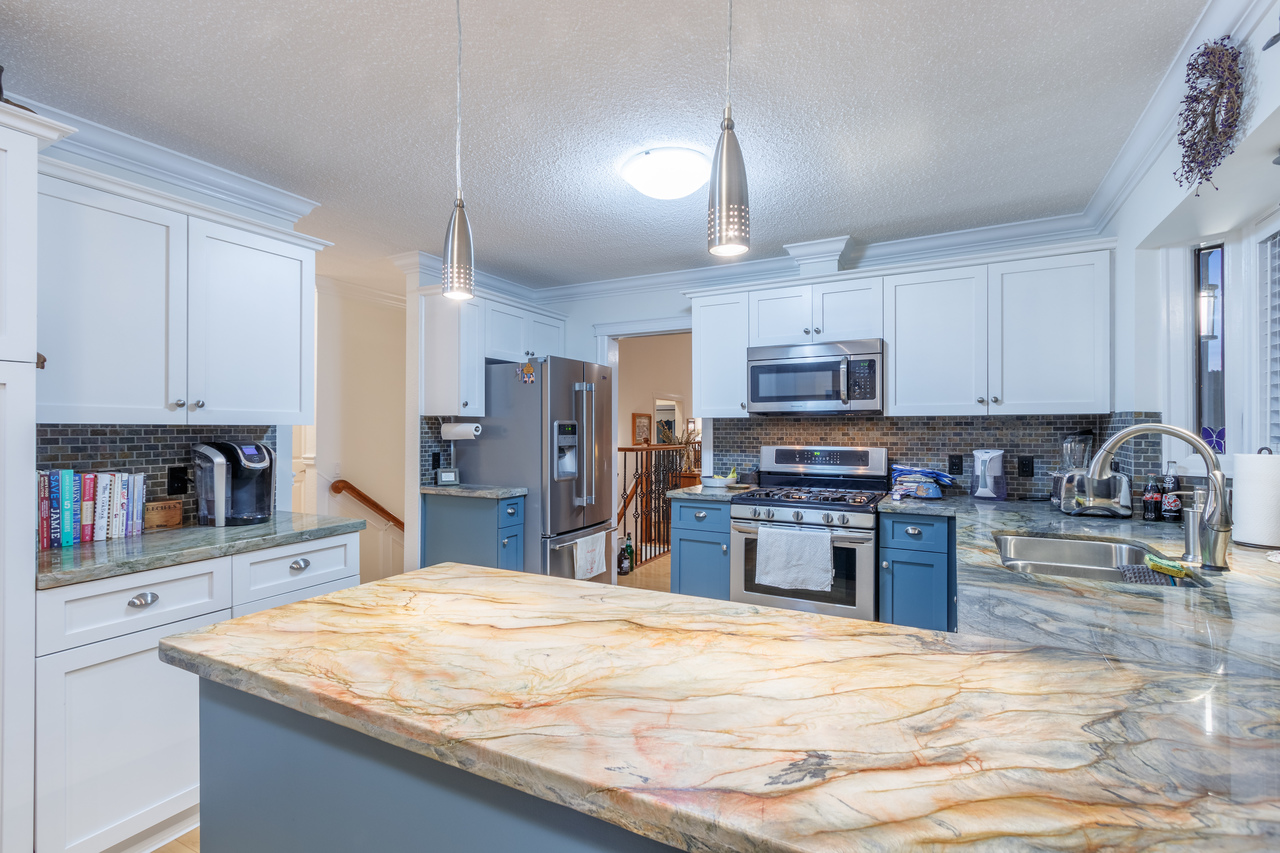 Double doors welcome you into a spacious foyer & up to the main level with maple hardwood, crown molding, & chair rail throughout. The impressive formal living room offers 13' vaulted ceilings, full-height windows, & a stacked stone fireplace focal point, while the adjoining dining area features 16' ceilings providing a bright & airy space to gather for a meal. The well-appointed kitchen, complete with shaker style cabinets, stainless steel appliances, & marble counters, meets all the chef’s needs, while a convenient eating nook, offering a welcome spot for a casual meal, leads to the family room providing access to the view deck the ideal venue for BBQ season, & to a sunroom in the rear for inclement days.