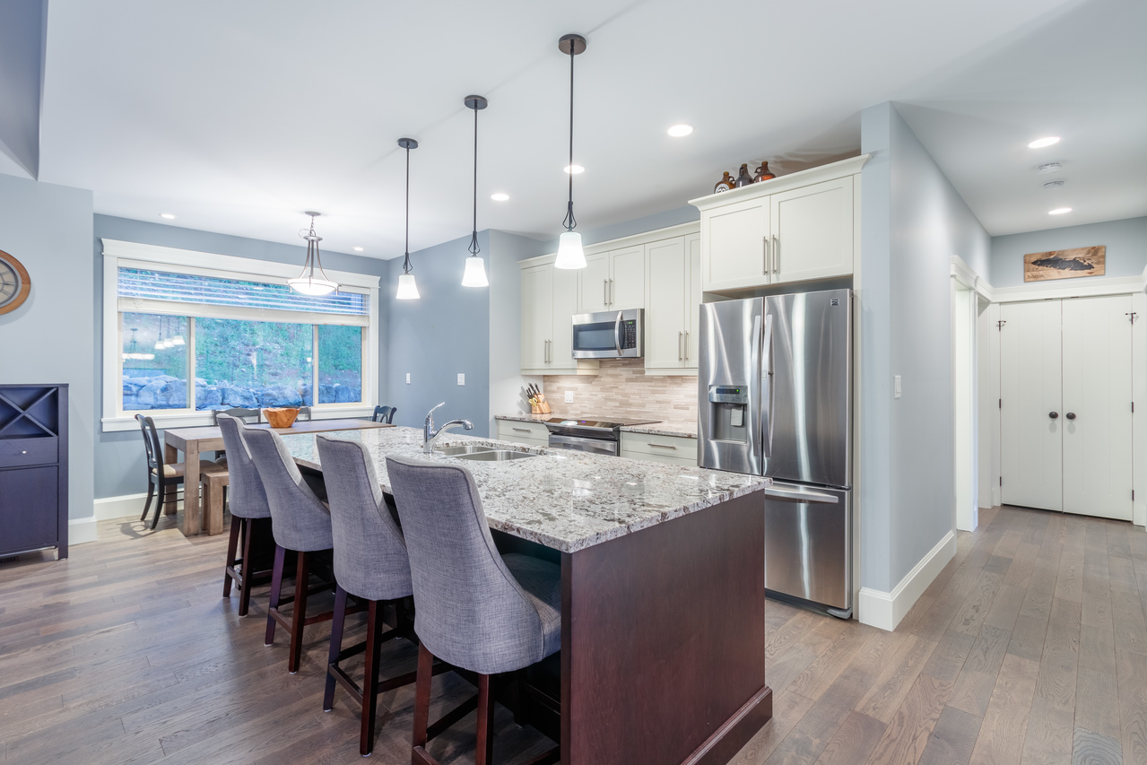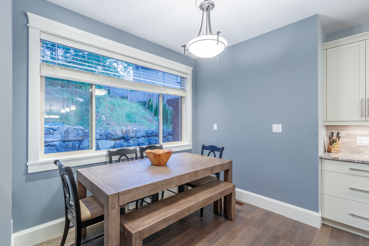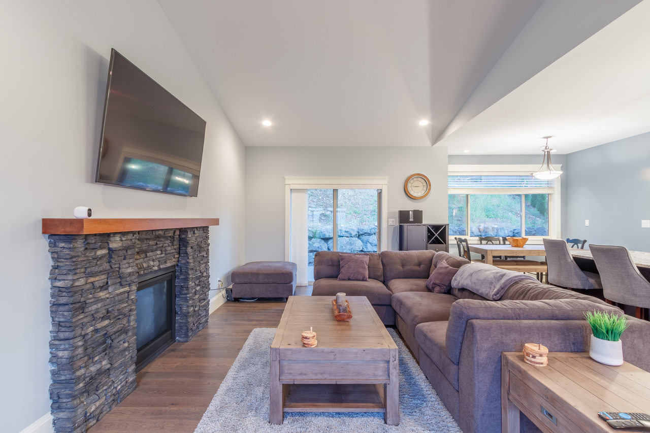 Ideal for entertaining or for spending time together as a family, the open concept main floor with engineered hardwood flooring offers a chef’s kitchen, the heart of the home, boasting granite counters, stainless steel appliances and a large island with a breakfast bar and plenty of room for meal prep, while the adjoining dining area is the ideal spot for a casual meal or for more formal dining. The living room features 11’ vaulted ceilings and a stacked stone fireplace, perfect for a cozy evening in or for adding ambiance whatever the occasion, and opens up to the sizeable patio, an extension of the living area with a pergola and hot tub and sloped backyard providing a private backdrop, ideal for entertaining or for everyday use.