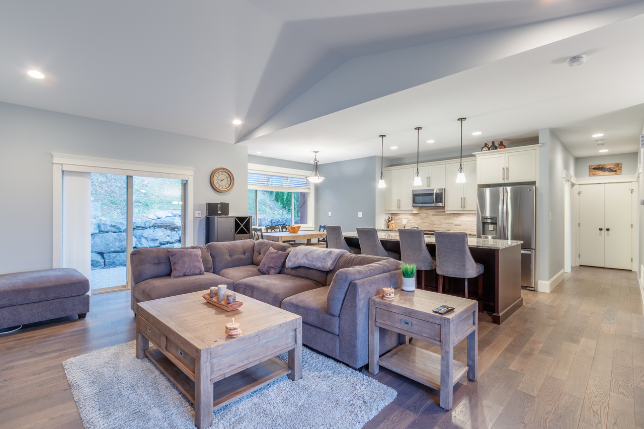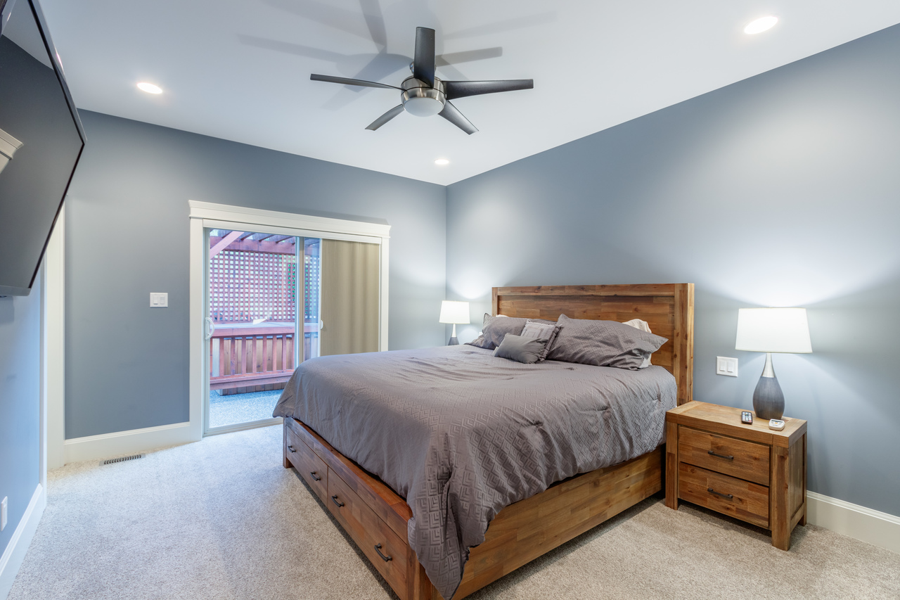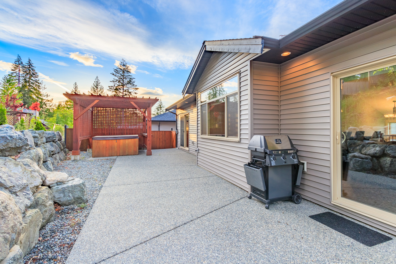 There are 3 bedrooms on this family-friendly main level including the master with a 3-piece ensuite featuring a spacious walk-in shower with rain showerhead, a walk-in closet, and convenient access to the patio for your morning coffee or for an evening soak in the hot tub, while a tasteful 4-piece main bathroom and laundry facilities round off this space.
