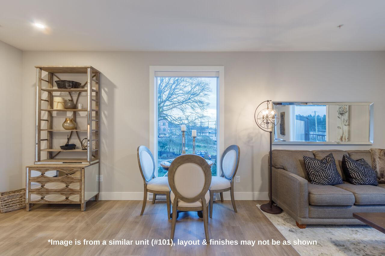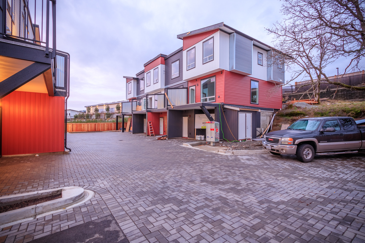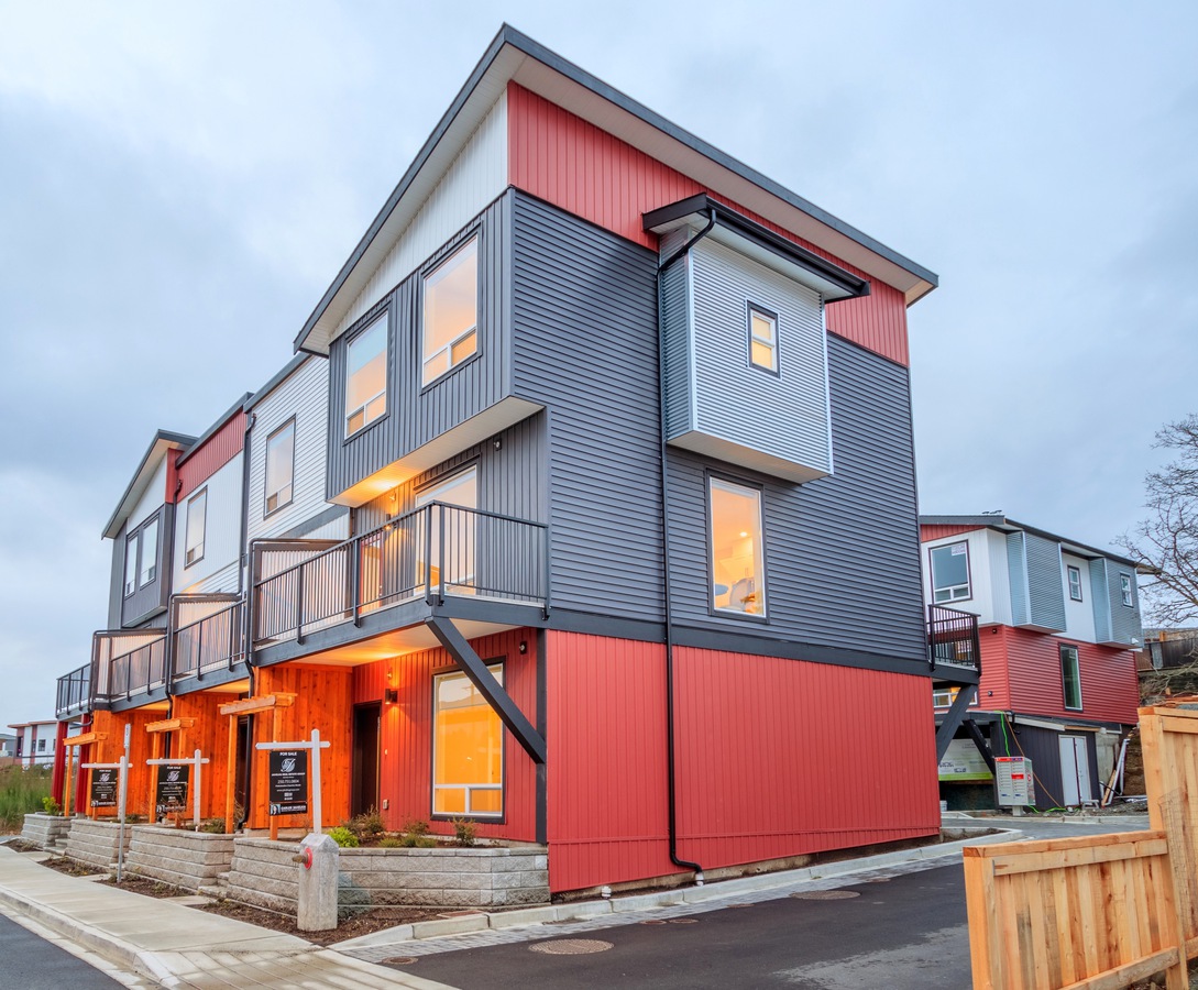 Situated at the end of a quiet cul-de-sac, framed by protected Garry Oak trees and sustainable plantings, Building 2 will be home to Unit 108 and four other homes, boasting a striking west coast exterior with a modern color palette of white, red, and charcoal with stained wood and metal accents.