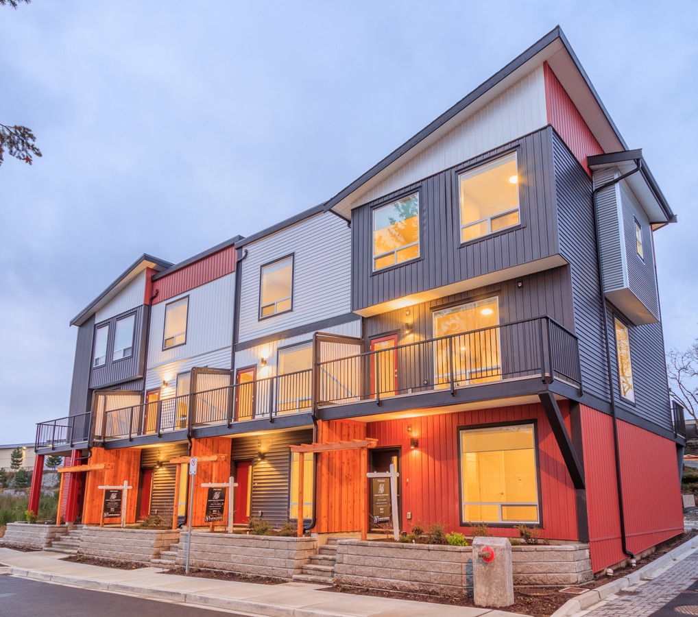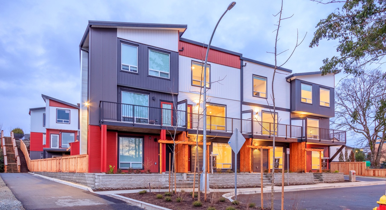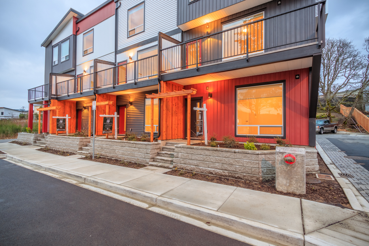 Situated at the end of a quiet cul-de-sac, framed by protected Garry Oak trees and sustainable plantings, Building 1 is home to Unit 103 and three other homes, boasting a striking west coast exterior with a modern color palette of white, red, and charcoal with stained wood and metal accents.